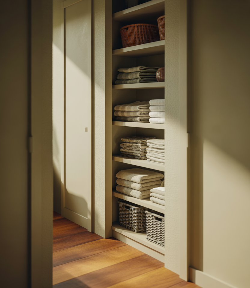 Linen closets in narrow hallways must be designed with intention, not excess. To avoid a cramped feeling, utilize shallow shelves, soft neutral colorways, and consistent spacing. This works beautifully in older homes with small hallways. In these situations, the storage needs to blend into the foot traffic without visual clutter or large doors.