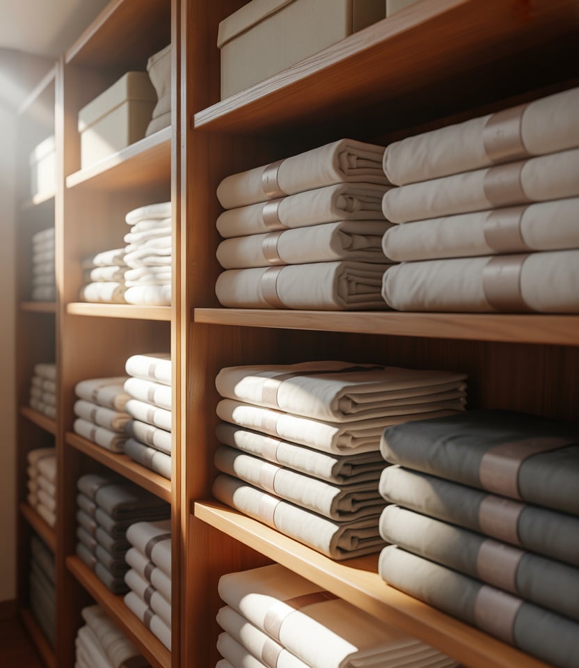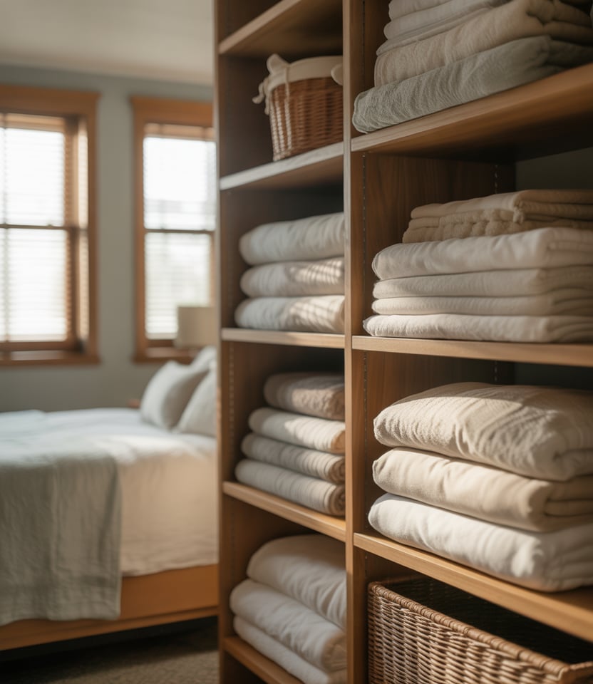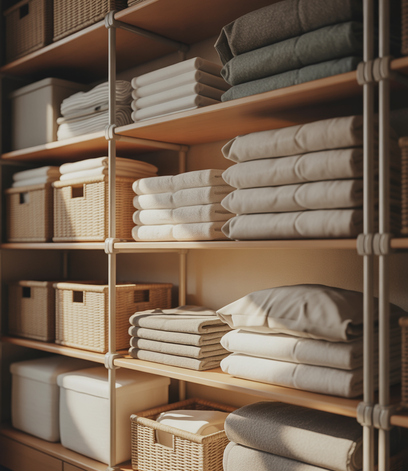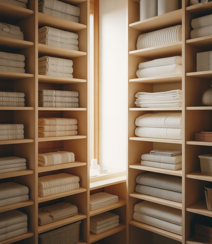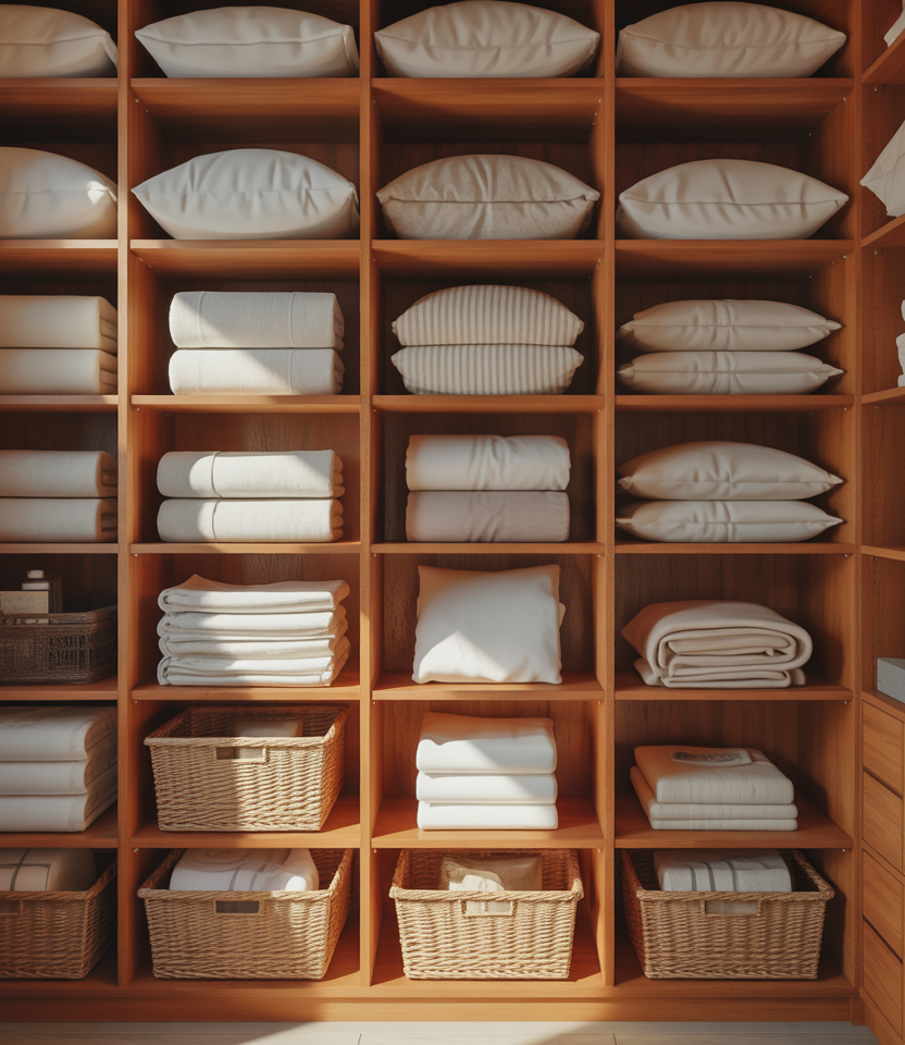 A deep shelf setup is ideal for storing bulky items like sheets and comforters. Thoughtful folding techniques prevent stacks from toppling while maximizing every inch of depth.