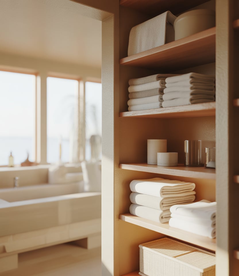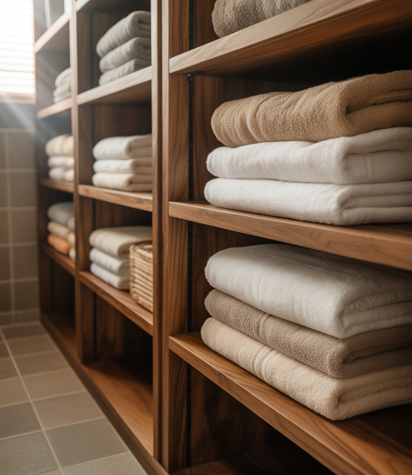 A linen closet integrated into the bathroom benefits from deep shelf construction that accommodates bulky towels and folded bath mats. This layout pairs well with Ideas bathroom shelves that prioritize capacity while still looking clean and intentional.