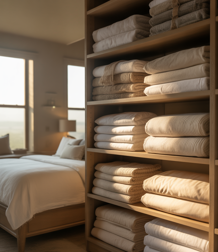 An Aesthetic, The open linen closet inside the master suite turns everyday storage into part of the room’s visual rhythm. Coordinated fabrics, neutral tones, and consistent folding elevate basic linens into a design feature.