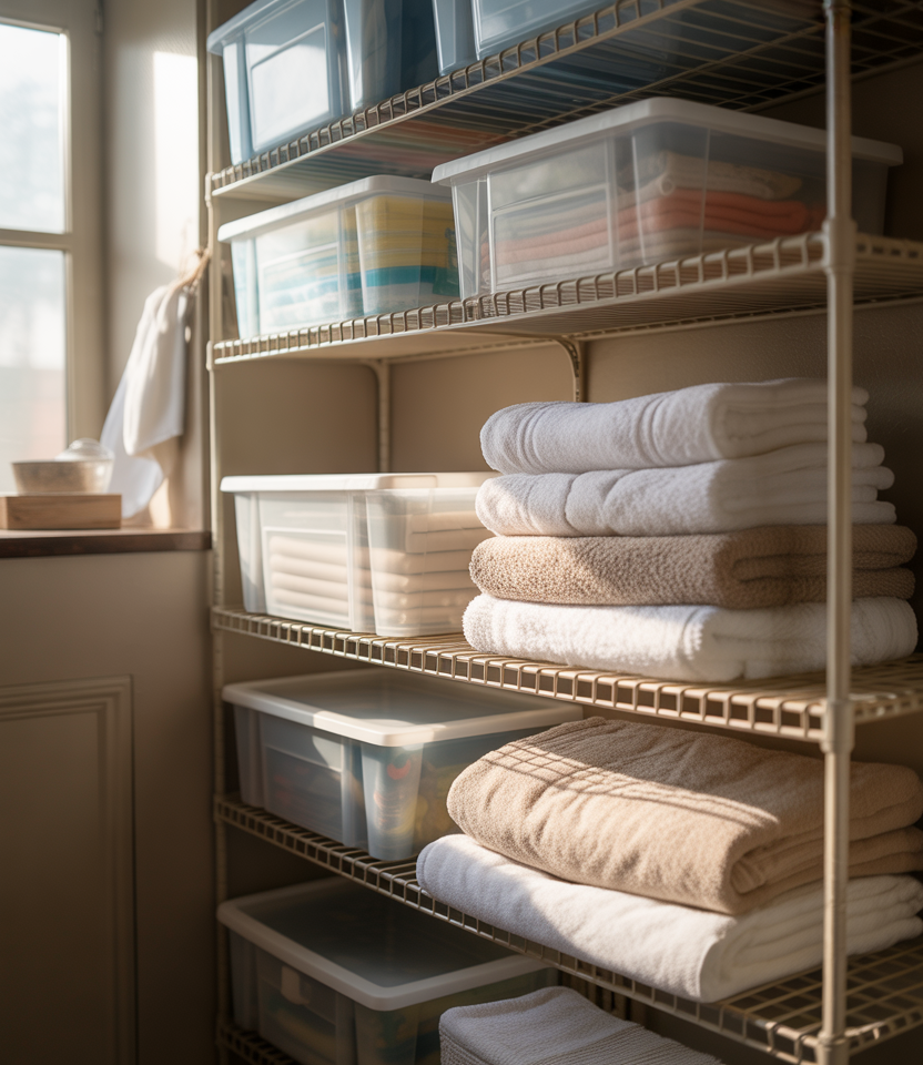 A thoughtful DIY linen closet doesn’t require a renovation budget. With smart use of Dollar Tree bins and simple wire shelving, even dated closets can feel refreshed. The focus is on consistency rather than expensive materials.