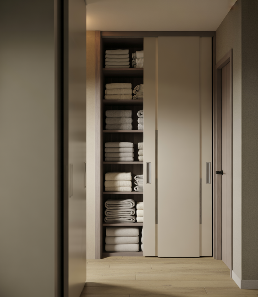 Adding a linen closet to the hallway with slim sliding doors keeps traffic flow smooth. This solution aligns well with modern hallway ideas that prioritize clean lines and minimal visual interruption.