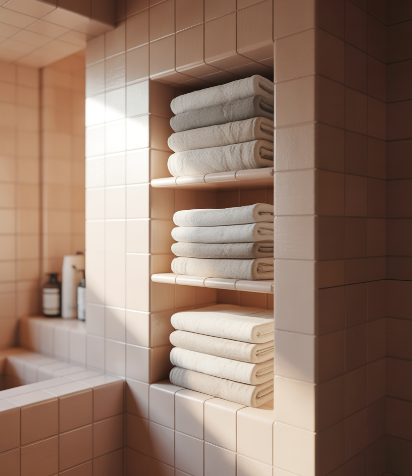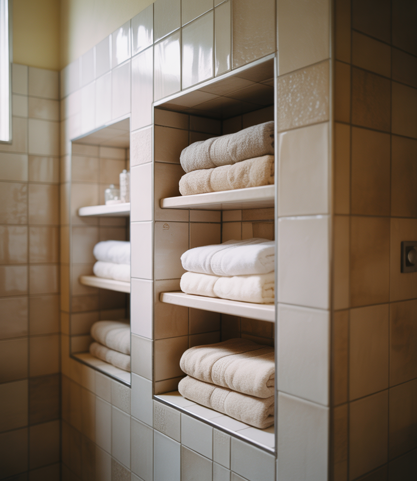 In a tiny bathroom, a recessed linen niche provides storage without sacrificing floor space. This concept pairs naturally with Ideas bathroom layouts that incorporate built-ins as opposed to furniture.