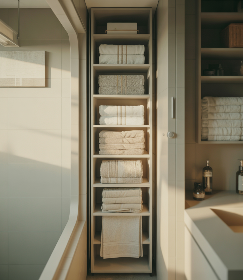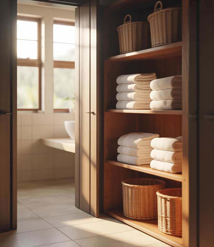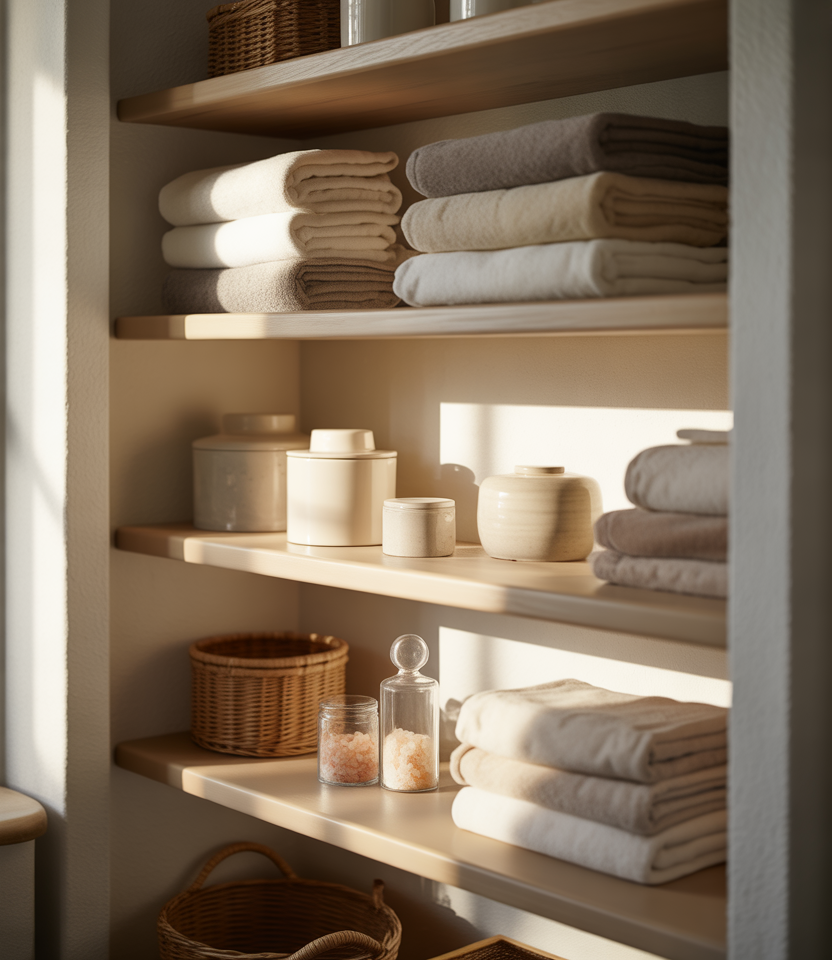 When square footage is limited, combining linen storage with IDEAS bathroom layouts is practical. Compact shelving systems inspired by IKEA’s small-space storage solutions help keep essentials close without overwhelming the room.