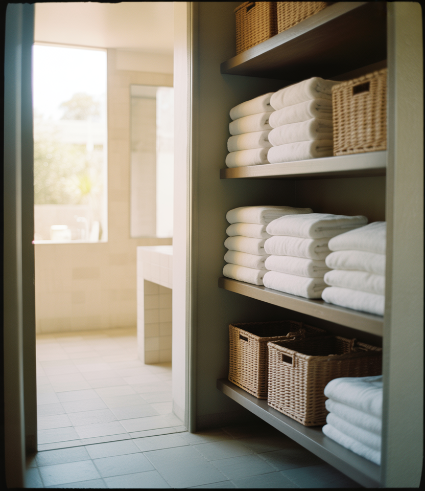 2. Bathroom-Adjacent Linen Closet with Open Shelving
