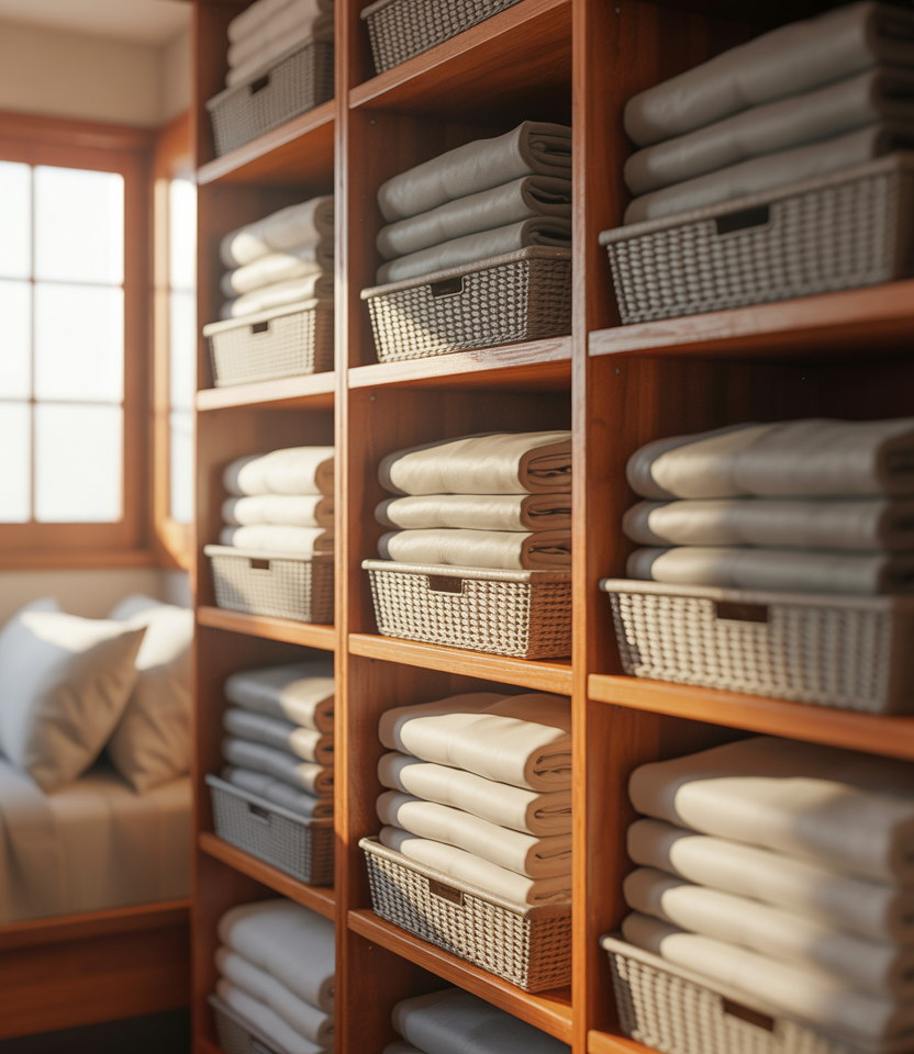 An aesthetic linen closet dedicated to sheets brings order to one of the most frustrating storage categories. Uniform folding and soft, neutral containers transform a functional need into a visually calming moment inside the home.