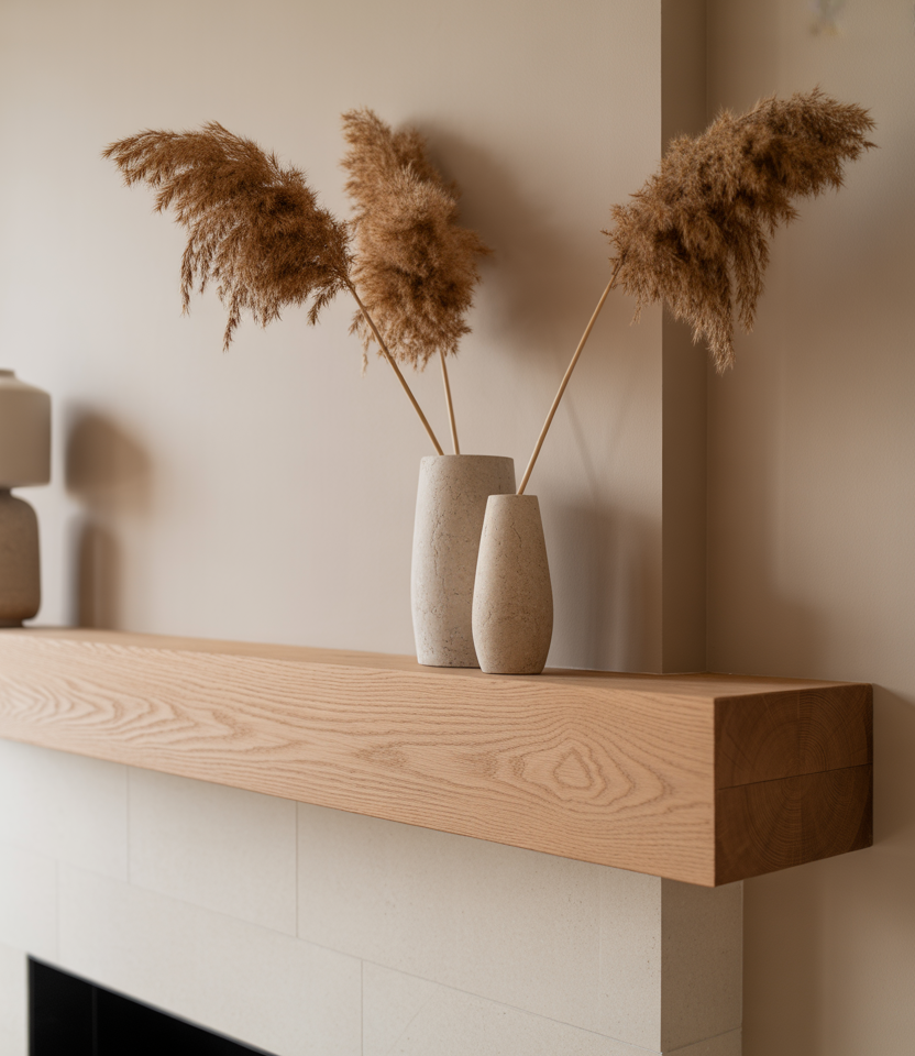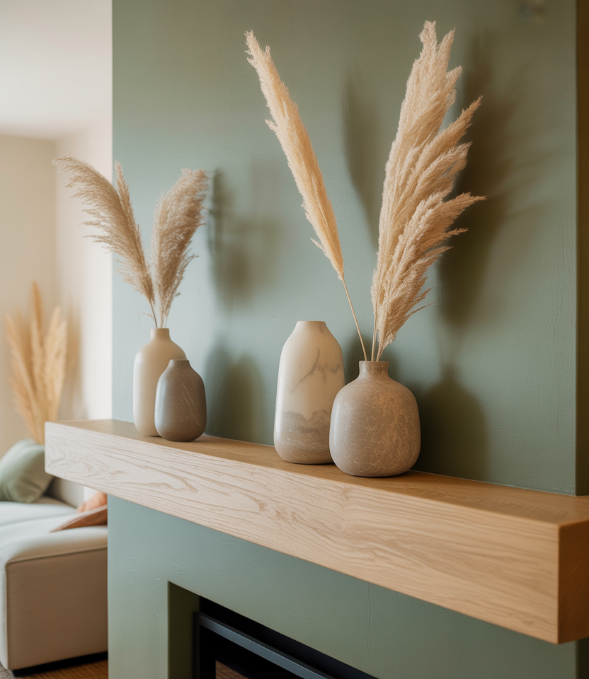 A contemporary natural mantel fuses modern structure with earthy calm. Picture smooth stone vases, dried grasses, and a single sculptural branch against a matte wall. Designers at Dwell say the best natural interiors balance simplicity with life. I’ve tried this look myself—just a pale oak beam and a minimalist arrangement of pampas grass—and it makes the room feel quietly centered and warm all year long.