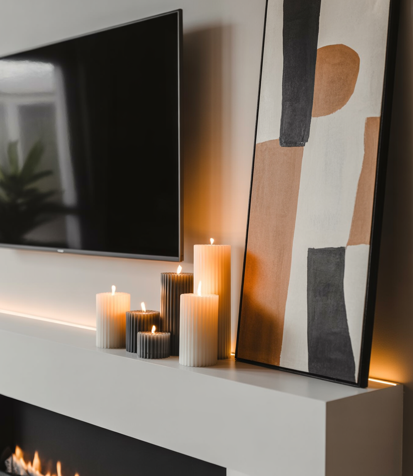 In many modern homes, the mantel is positioned at a corner, or the hearth is adjacent to a wall with a mounted TV, meaning the usual central display must adapt. A contemporary corner mantel calls for angled placement, lower height accents, lean-in artwork instead of centered, and smart integration with the TV zone. As one blogger notes, “For mantels with TVs above or next to fireplaces,” you need to consider scale and balance differently. Laurel Home+1 From experience, when my living room had the TV mounted above the fireplace, I offset the mirror and used asymmetric candle groupings—so the mantel felt intentional rather than competing with the screen.