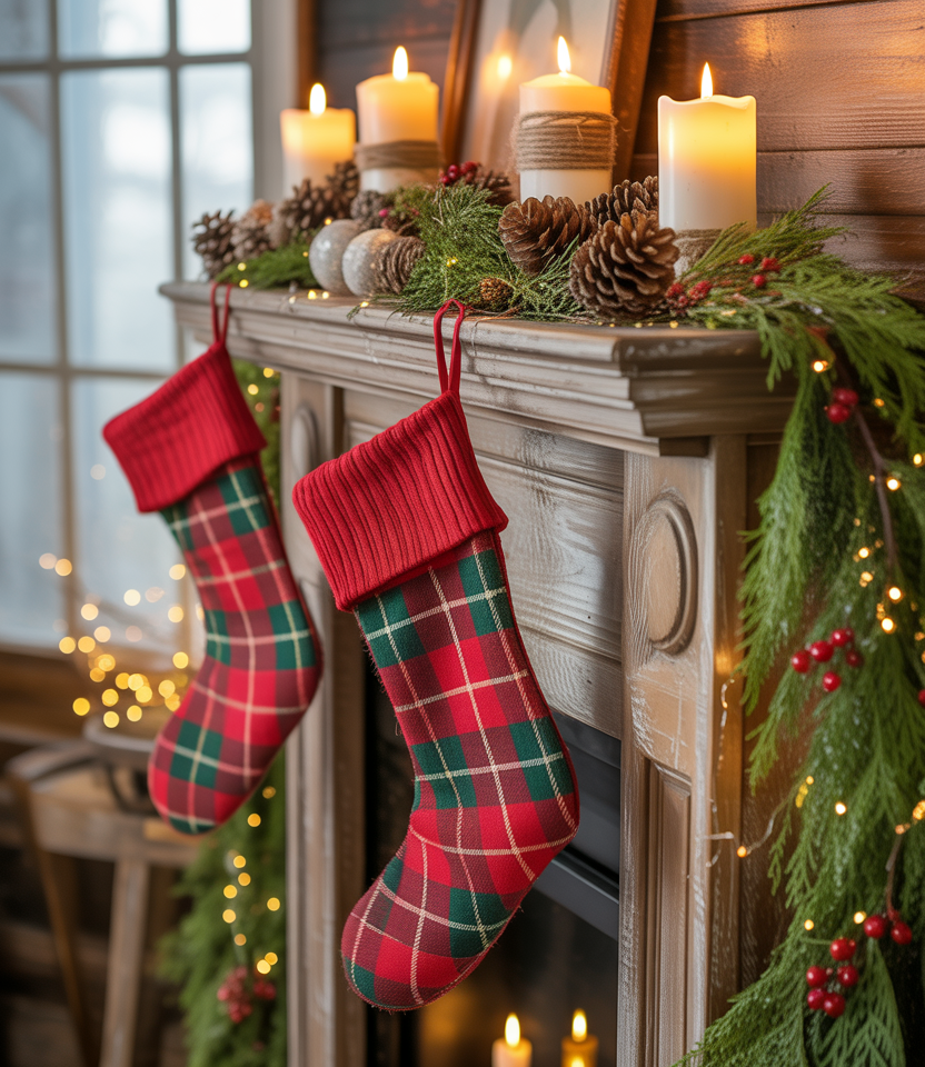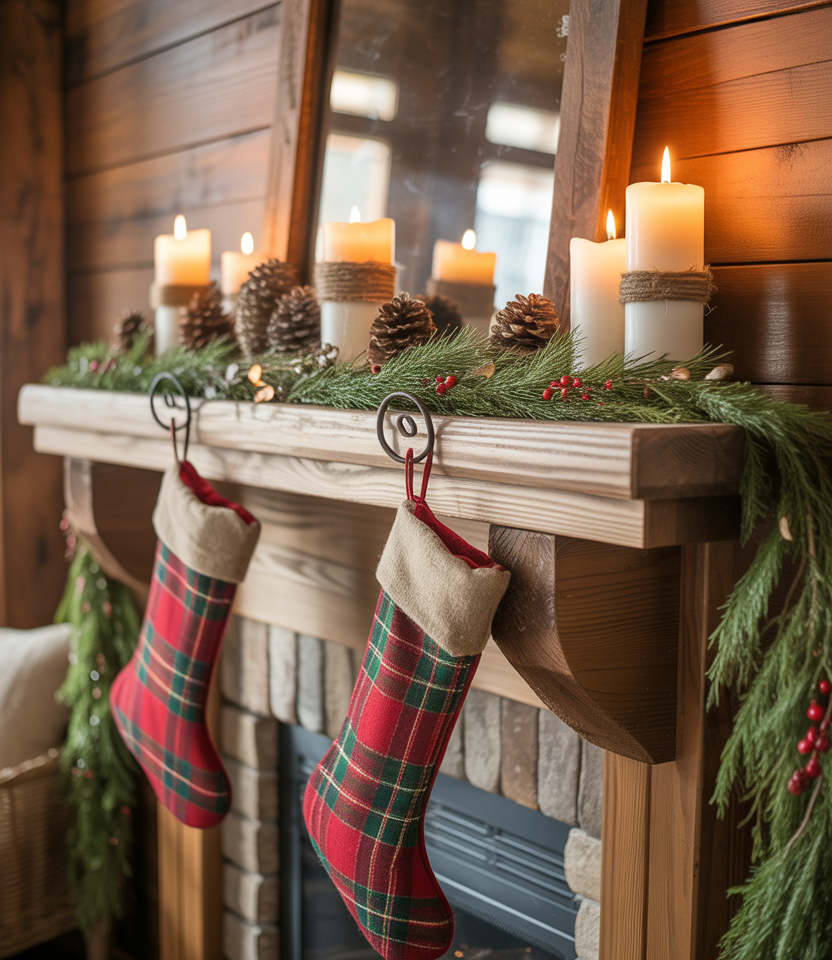 For lovers of texture and coziness, a rustic Christmas mantel brings the magic of a log cabin into your home. Combine plaid stockings, raw wood garlands, pinecones, and string lights for a heartfelt nostalgic look. Decorator Joanna Gaines often reminds us that the secret to rustic charm is imperfection—mixing natural and handmade items. I used twine-wrapped candles and evergreen sprigs one year, and my living room felt like a warm hug.