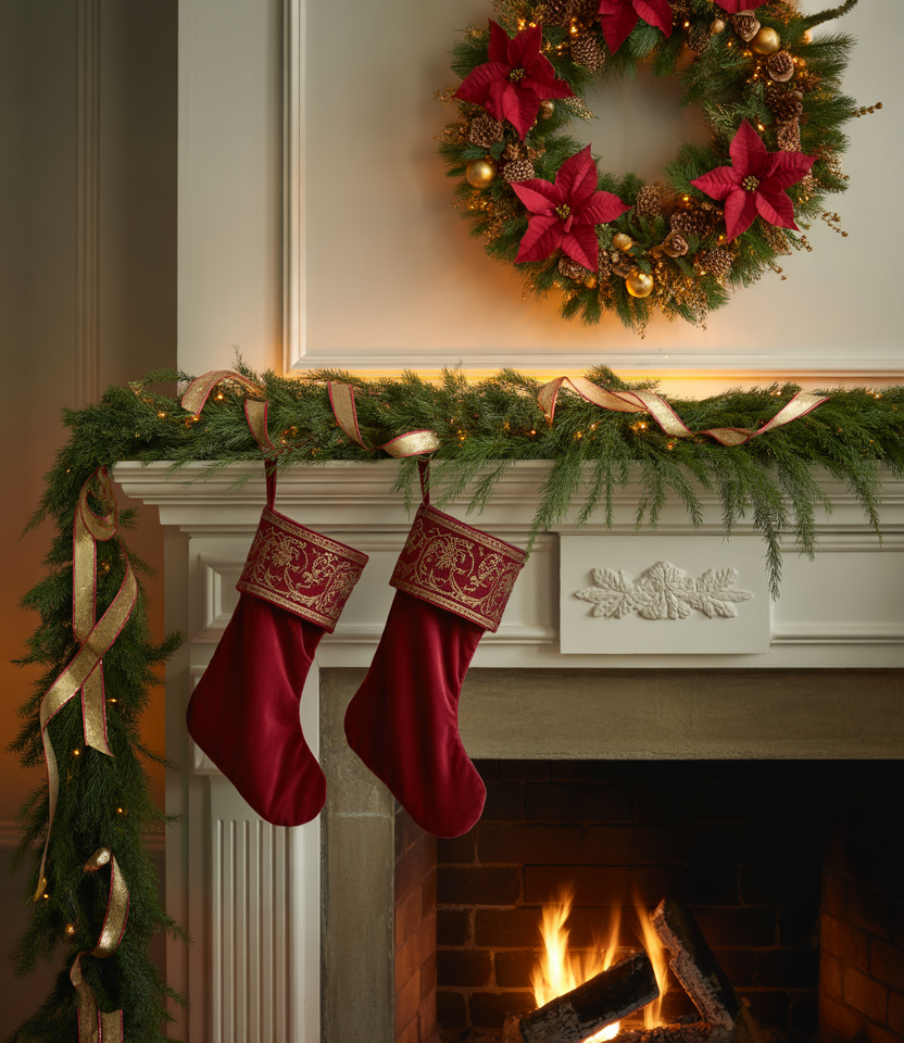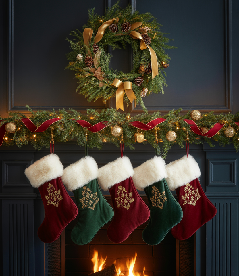 A traditional Christmas mantel never goes out of style. Think classic reds, greens, and golds, and maybe a large statement wreath over the fireplace. Add velvet stockings, brass candleholders, and sentimental ornaments collected over years. Martha Stewart once wrote that “tradition gives warmth to design”—and I couldn’t agree more. Every December, I recreate my grandmother’s mantel with holly branches and heirloom ornaments for that timeless glow.