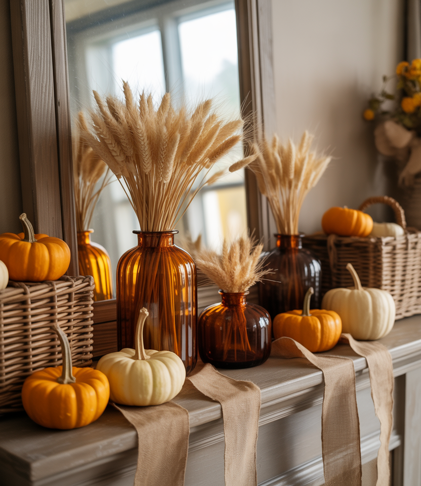 Celebrate the bounty of the season with an autumn harvest mantel layered in amber glass, mini pumpkins, and wheat bundles. This look brings cozy farm-to-home charm without clutter. Influencers from Country Living suggest mixing natural materials like rattan and burlap for depth. I love using dried corn stalks and tiny gourds—the combination feels authentic and delightfully nostalgic.
