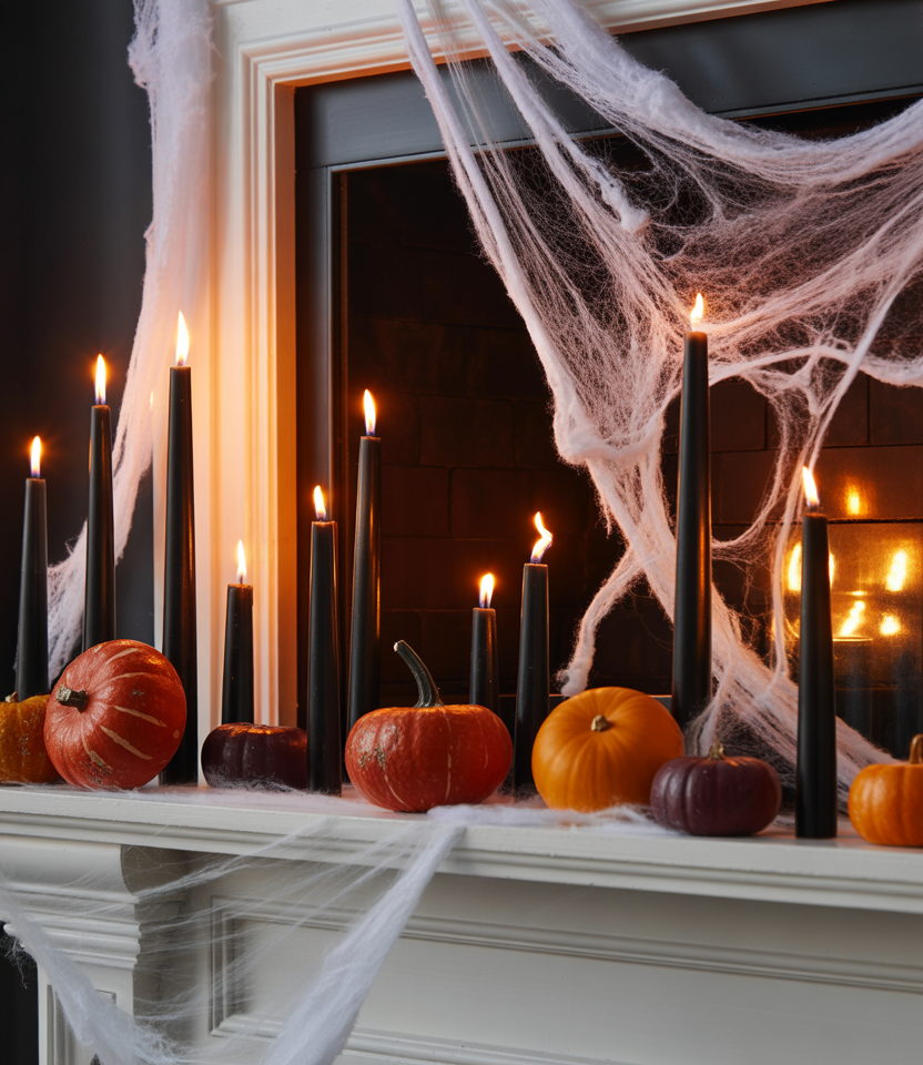 For October fun, a Halloween mantel lets your creativity shine. Combine black candlesticks, gauzy fabric, pumpkins, and subtle spiderweb touches. Avoid plastic gimmicks—elegant spooky is the new trend. Design Milk notes that “modern Halloween décor focuses on atmosphere rather than excess.” I love placing flickering LED candles and a few black-and-white prints for understated spook.
