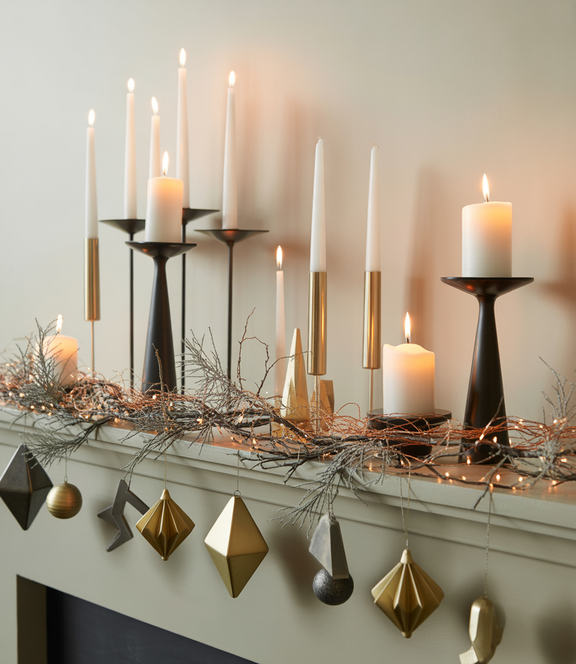 A modern Christmas mantel in 2026 embraces simplicity—geometric shapes, sleek metallics, and monochrome color palettes. Instead of traditional garlands, try a sculptural branch or minimal greenery. Designers like Shea McGee favor uncluttered lines to let the materials shine. I used matte-black candlesticks and white ornaments for a quietly festive look that still felt sophisticated.