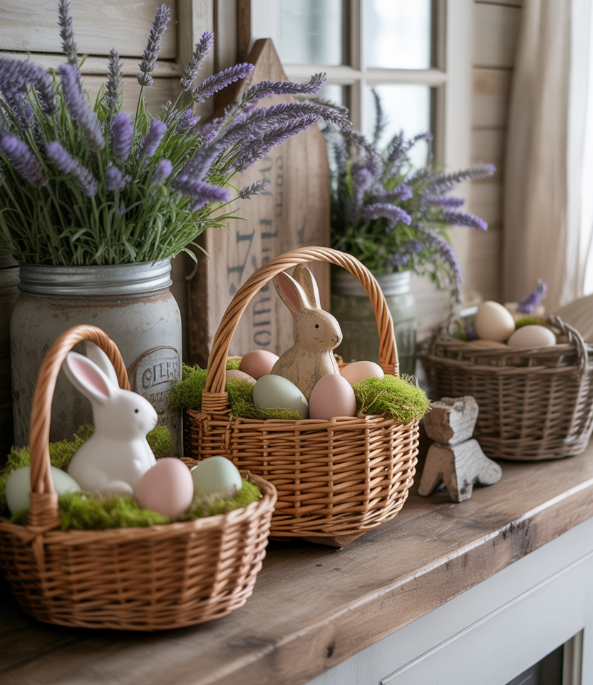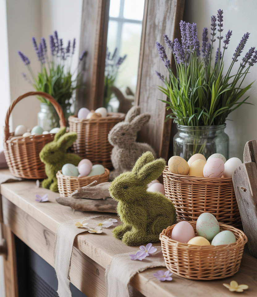 Bring spring charm indoors with a rustic Easter mantel full of wicker baskets, moss bunnies, and soft pastels. Natural wood tones and muted florals ground the look. Decor pros from HGTV recommend using neutral backdrops so seasonal colors pop. I once layered wooden egg crates and lavender stems—it smelled like the countryside in bloom.