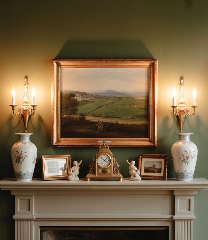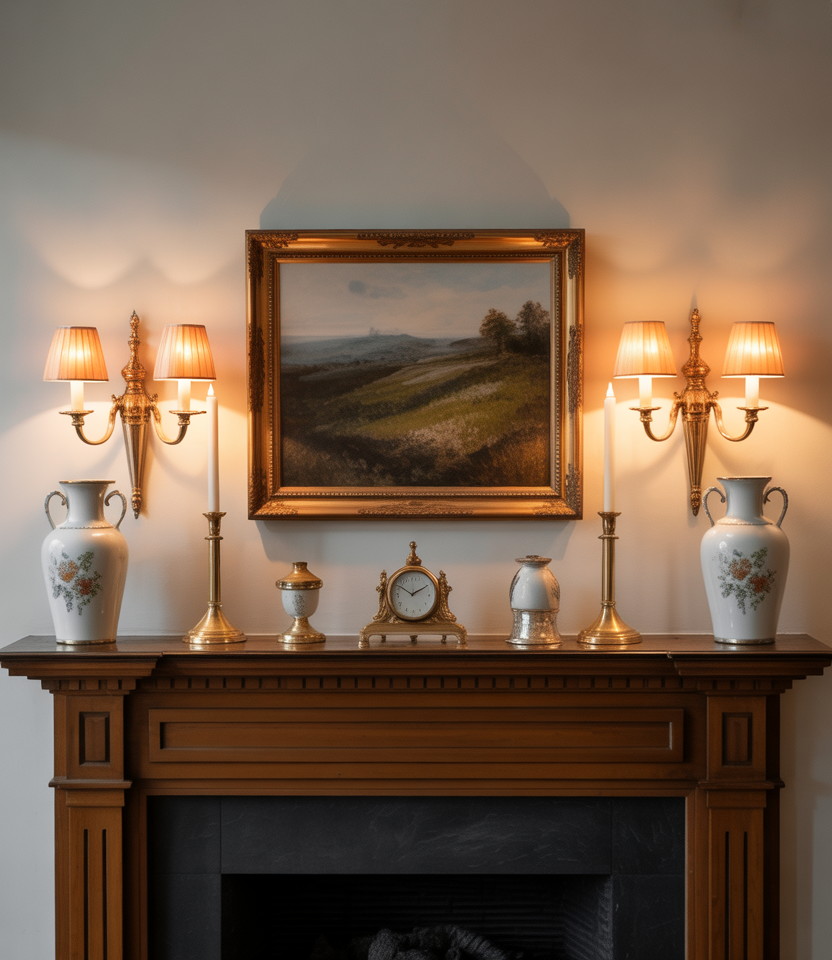 If you lean toward timeless design, a traditional everyday mantel blends order and comfort—symmetry, classic materials, and familiar colors. Pair brass sconces, framed landscapes, and porcelain vases for balanced elegance. According to Veranda Magazine, “symmetry creates calm and confidence in any room.” My own mantel mirrors this approach—it never feels dated.