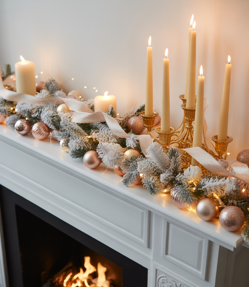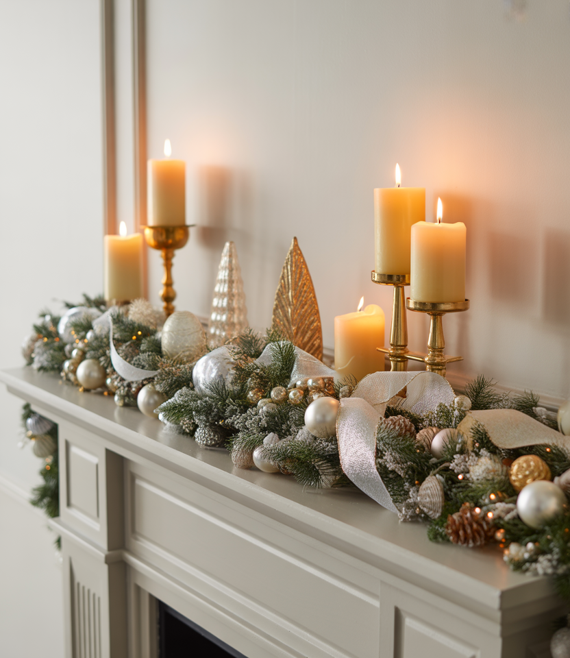 For the holiday season, a mantel styled with an elegant Christmas vibe invites warmth and celebration without feeling gimmicky. Think white and metallic accents, crystal ornaments, and soft lighting rather than overly bright traditional reds and greens. According to inspiration from the blog at Balsam Hill, the “sparkle with silver and gold” mantel theme brings sophistication to holiday décor. Balsam Hill Blog My own mantel this year featured white battery-LED branches and gold candleholders, and the subtle glow made the space feel both festive and restful.