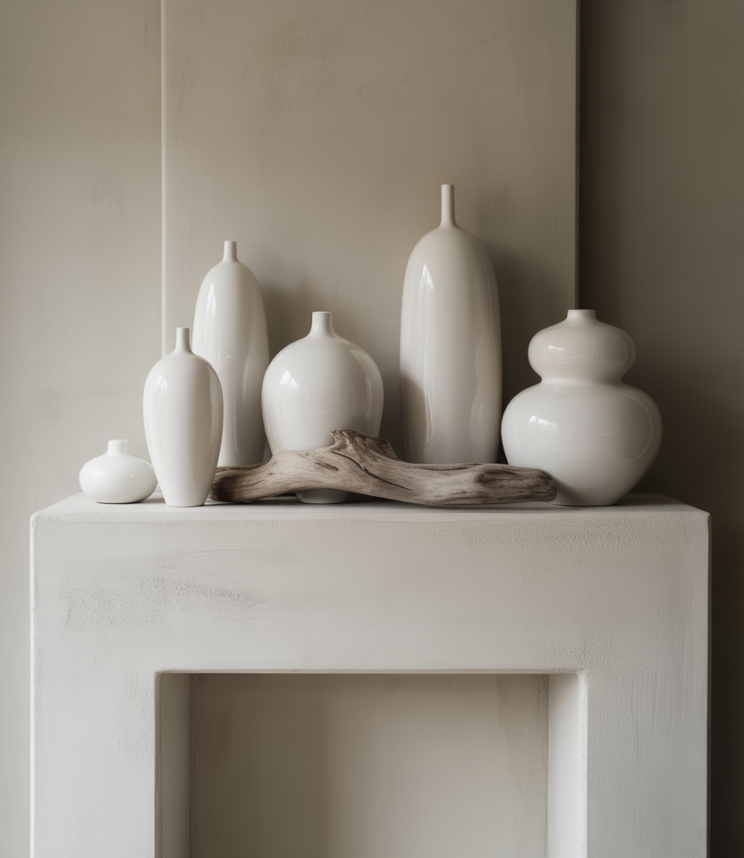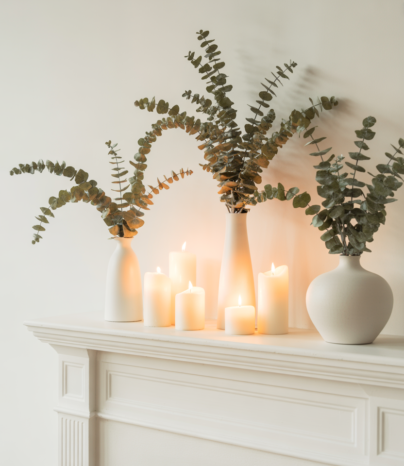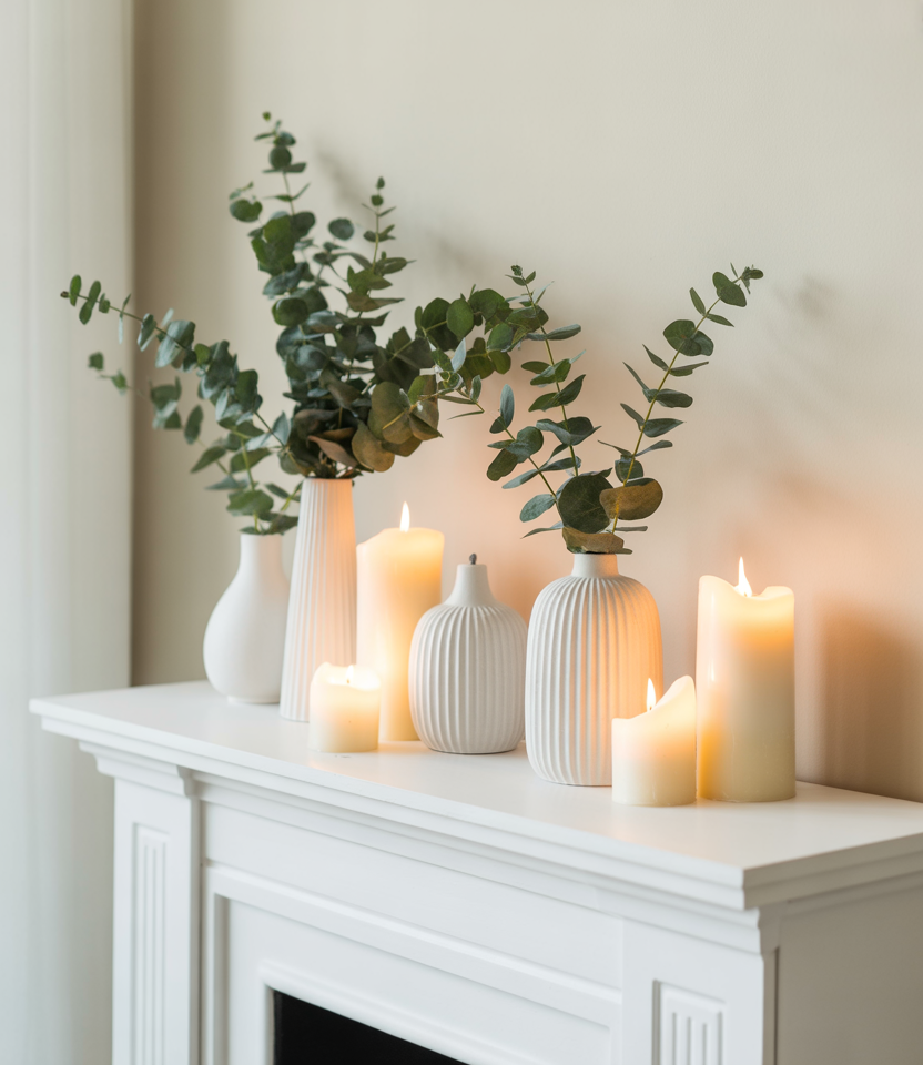 For those who gravitate toward a fresh, airy aesthetic, the white everyday mantel offers serenity and lightness. Using crisp white décor, pale ceramics, white candles, and subtle greenery (eucalyptus or olive branches) creates a year-round look that still accommodates seasonal touches when the time comes. According to home decorators, a consistent palette helps transition smoothly between seasons. Fracture | Blog My living room has a white mantle shelf and whiteware vases—it stays visually calm, and I simply swap in seasonal accents on top.
