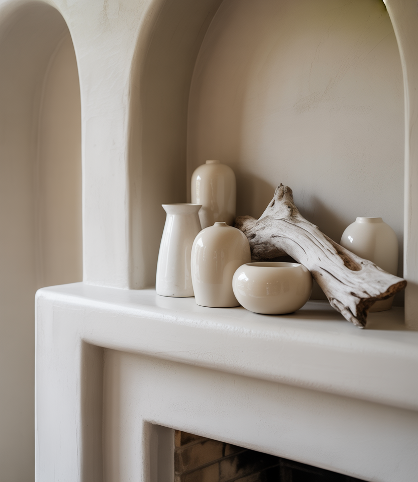 For those drawn to purity and form, a contemporary white mantel offers clarity and light. The key is texture—mix matte plaster, glossy ceramics, and linen-wrapped accents for depth. Designers on Apartment Therapy note that white décor “relies on touch as much as sight.” I recently styled mine with layered white vessels and driftwood—it radiated quiet strength.