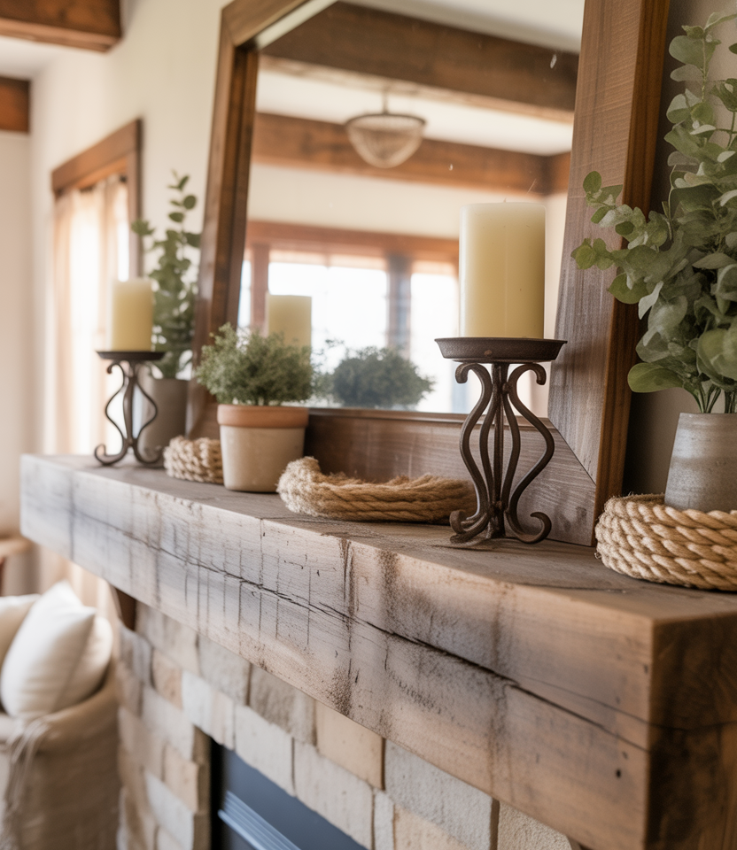 The rustic everyday mantel celebrates comfort and authenticity year-round. Weathered wood, iron accents, and woven textures make the space feel grounded yet lived-in. Design experts from Country Living say that layering natural fibers like linen and jute adds subtle richness. I keep a few terracotta pots and framed countryside prints—it’s peaceful without being predictable.
