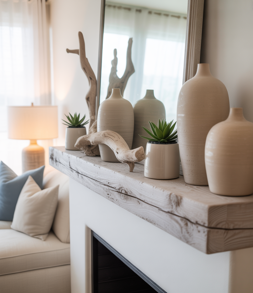 A modern coastal mantel pairs seaside serenity with minimalist structure—think whitewashed wood, sand-colored pottery, and subtle blue accents. The trick is restraint; skip seashell overload for curated simplicity. Designers like Becki Owens note the power of “quiet hues and clean lines.” My own mantel features driftwood and a single watercolor of the ocean for balance.