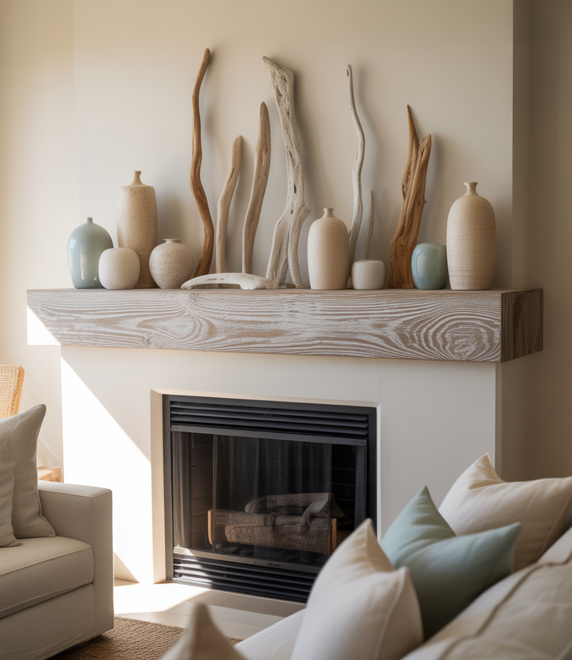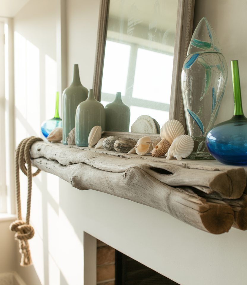 Living near the water or simply fond of a seaside mood? A coastal everyday mantel is a relaxed, breezy staging using driftwood, sea-foam green accents, glass floats, rope knots, and shells. The idea is to evoke the beach without it becoming a cliché. My personal trick: I placed a large white wooden paddle above the mantel and flipped it in winter for a garland of pine—so the same mantel adapts between seasons.