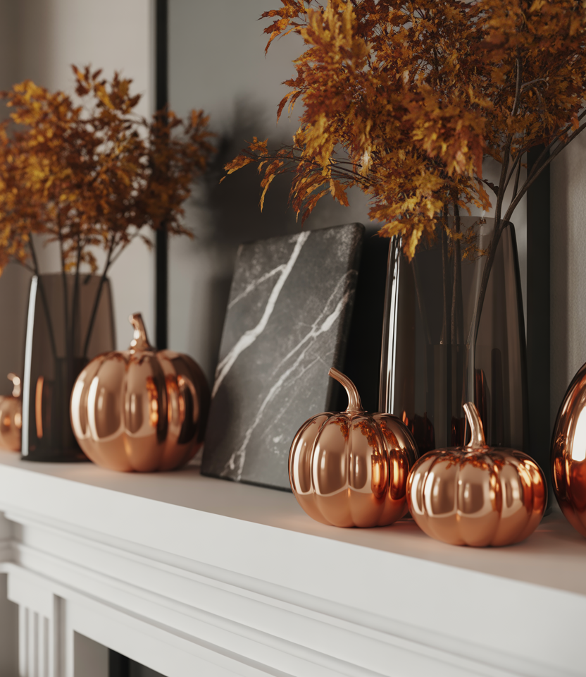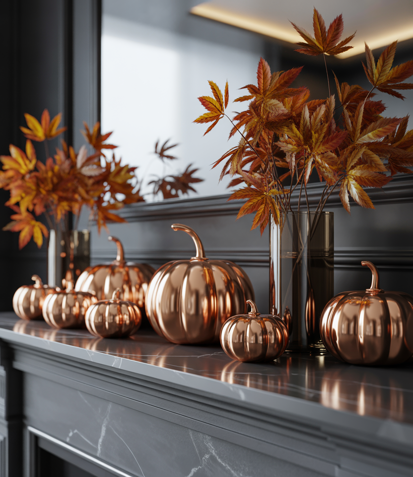 A contemporary take on fall décor mixes natural tones with sleek materials. Use glass vases filled with amber leaves, sculptural metal pieces, and a balanced composition of warm and cool shades. According to Elle Decor, blending texture and shine modernizes the season. I recently paired copper pumpkins with black marble—unexpected, yet strikingly elegant.