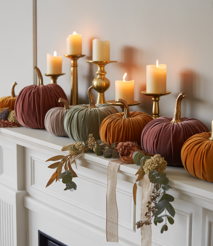 If your style leans sophisticated, an elegant autumn mantel will charm you. Layer velvet pumpkins, gold candlesticks, and muted florals against a soft neutral base. The look is graceful yet cozy. Designers at Veranda call it “quiet luxury for fall.” I love mixing champagne hues with cream linen—simple, timeless, and flattering in candlelight.