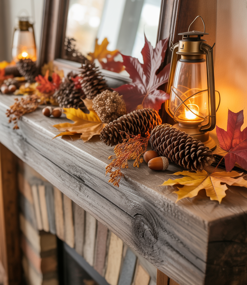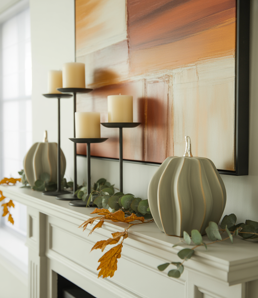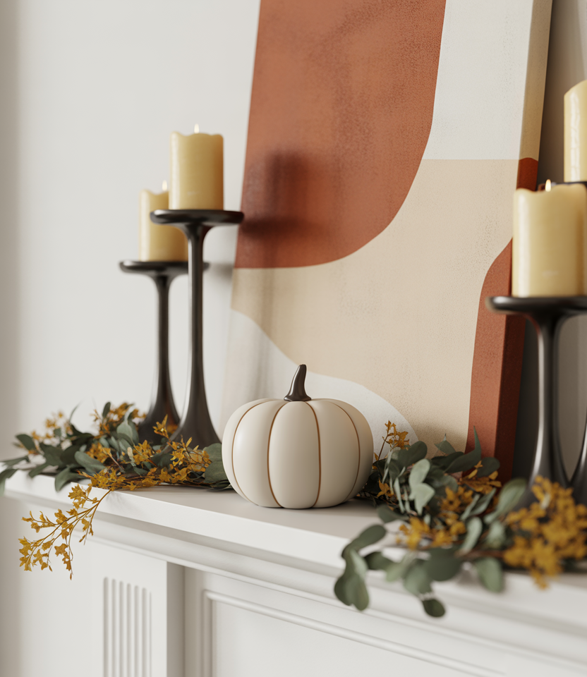 If you prefer a cleaner, more streamlined look, the modern fall mantel is your scene. Layers remain but are simplified: one large piece of abstract art, paired with sleek black or matte-metal candle holders, a neutral garland with minimal leaves, and perhaps a single sculptural pumpkin. Balance matters. As an article in Architectural Digest points out, “pair large and small items to create a sense of balance” on the mantel. Architectural Digest In my living room, that meant removing several knick-knacks and focusing on two standout objects—and the mantel instantly felt more considered.