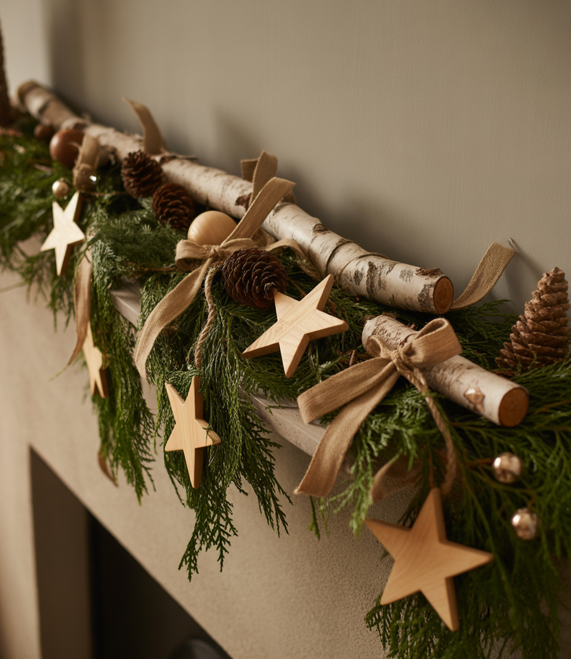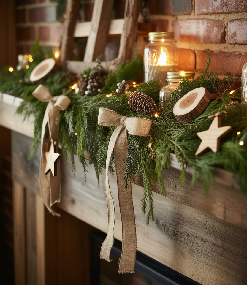 Combining the holiday spirit with organic textures, a natural Christmas mantel uses evergreen garlands, raw wooden elements, jute ribbons, and simple ornaments to evoke a forest-fresh feel. The Balsam Hill blog labels this the “rustic winter wonderland” variation: “Combine the rustic charm of the woodlands with the enchanting atmosphere of a winter wonderland.” Balsam Hill Blog I chose a long bough of cedar, hung simple wooden stars, and used twinkle lights—all of which made the mantel feel both festive and grounded.