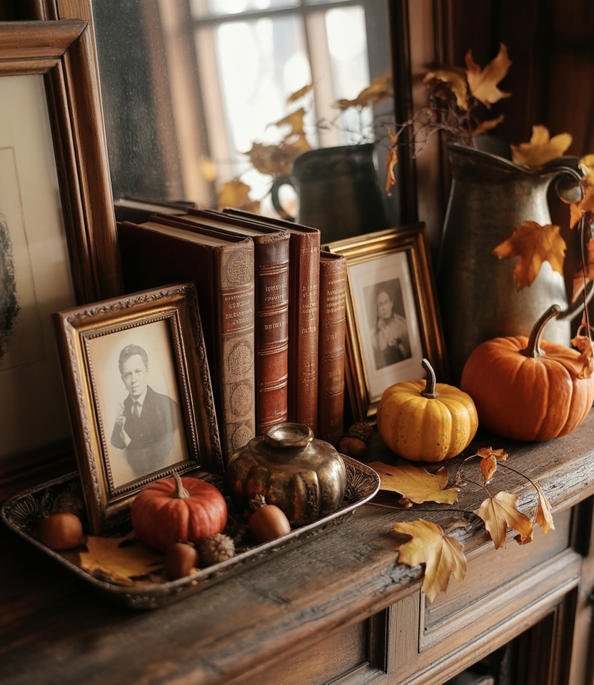 For those drawn to nostalgia, a vintage fall mantel embraces old-world charm: think antique frames, weathered signage, faded prints, stacked old books, and rust-tone pumpkins. Texture reigns, and the layered look feels curated over time rather than designed all at once. This aligns with the rustic vintage aesthetic of reclaimed materials and objects with history. Better Homes & Gardens I uncovered an old wooden crate and some vintage botanical prints at a flea market and positioned them on the mantel—suddenly the room felt lived-in and layered.