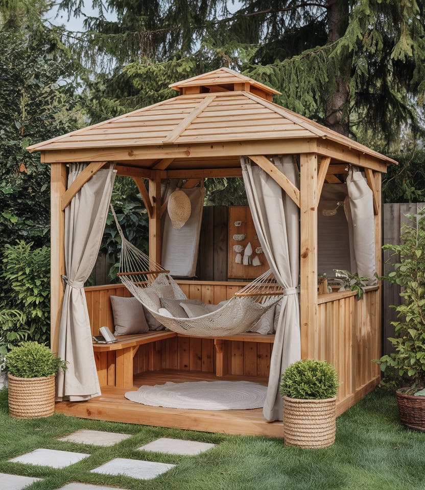 Convert your gazebo into a cozy cabana next to your pool. Use screened sides or fabric curtains for privacy. Include seating, a wet bar, or small outdoor kitchen counter. I stayed at a resort whose poolside cabins felt more like gazebos—they were favorite lounging spots all day.