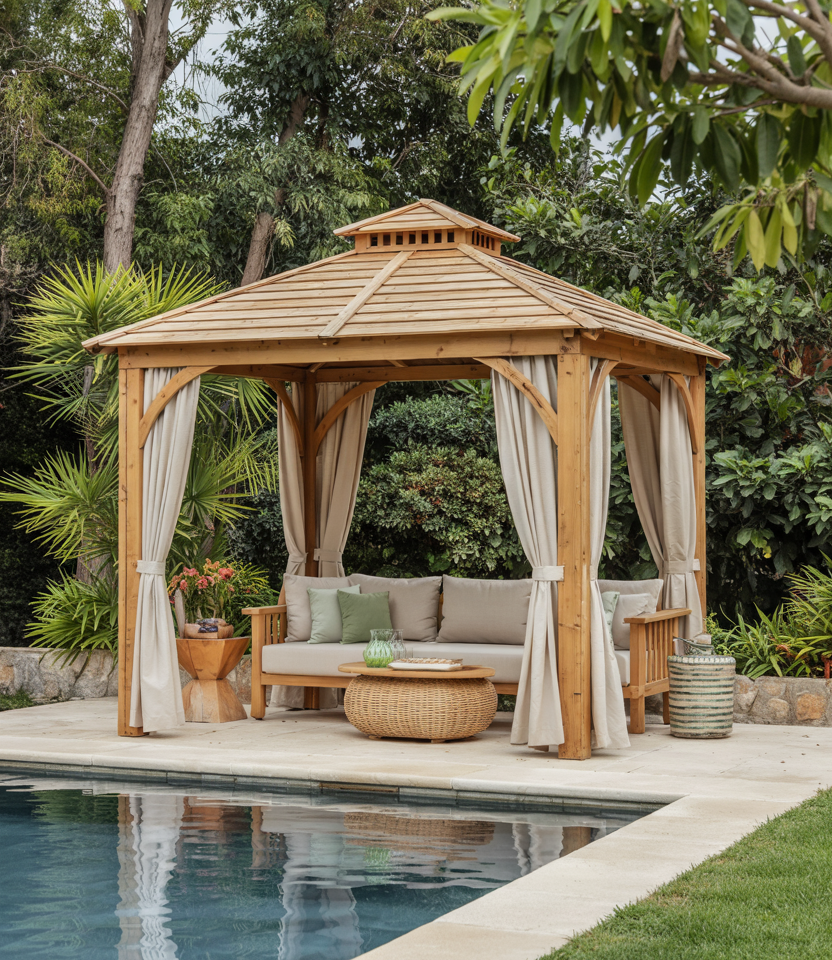 It is a covered gazebo with an elegant roof and flowing layers of sheer drapes, providing soft shade. The light fabrics create a boho or resort feel. This design looks good installed beside pools or terraces. The draped gazebo by the pool at a boutique resort I stayed at felt like a dreamy escape.