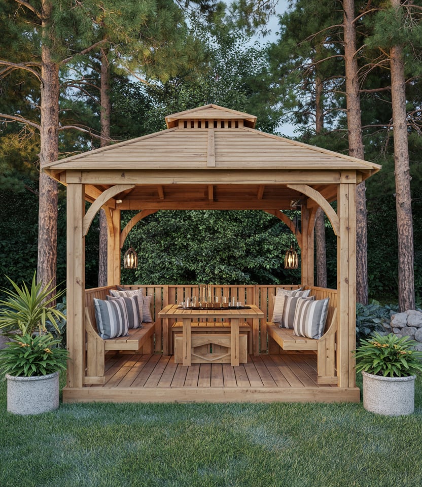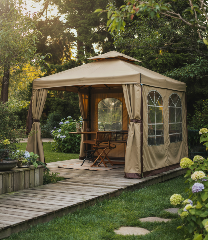 A large gazebo with high ceilings and open spans can host parties, weddings, or communal dinners. Combine with optional enclosures or open sides. I once attended a neighborhood party under a grand pavilion, and the space felt airy yet intimate when softly lit.