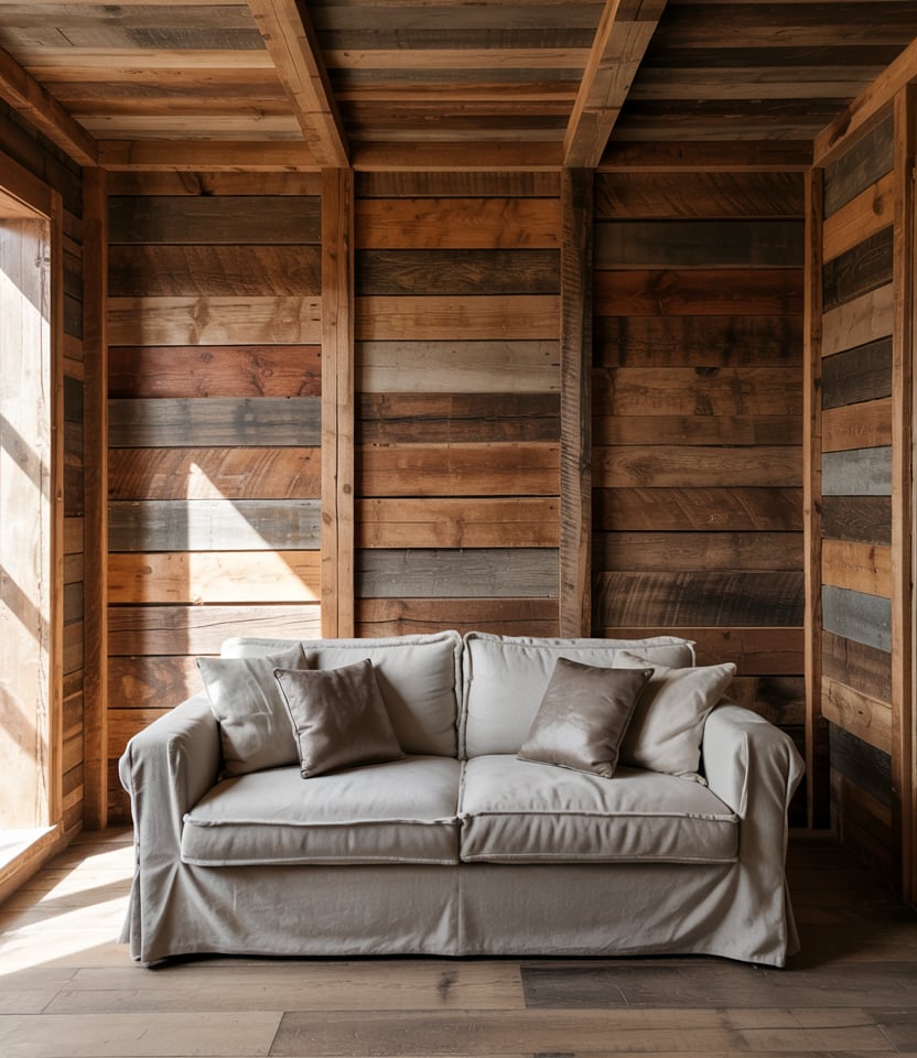 Follow the wood drenching trend: clad walls, ceilings, or built-ins in warm wood tones. Combine with neutral upholstery (grey or off-white) and stone or planted accents to avoid heaviness. Dramatic and richly grounded.