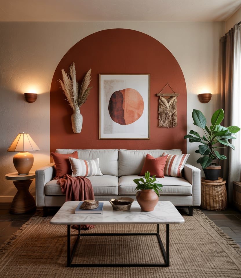 One way to anchor a space is choosing a paint color idea in terracotta or clay tones for a focal wall, paired with neutral furnishings and natural textures. Against a grey couch or brown couch, the warm accent wall brings depth and cozy contrast, avoiding starkness. This idea suits small rooms or small space apartments by limiting color to one plane while the rest stays calm.