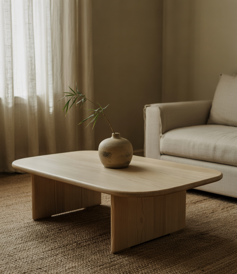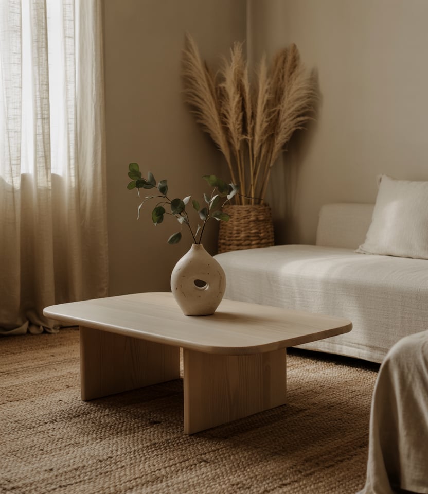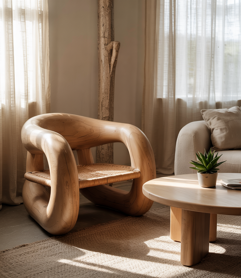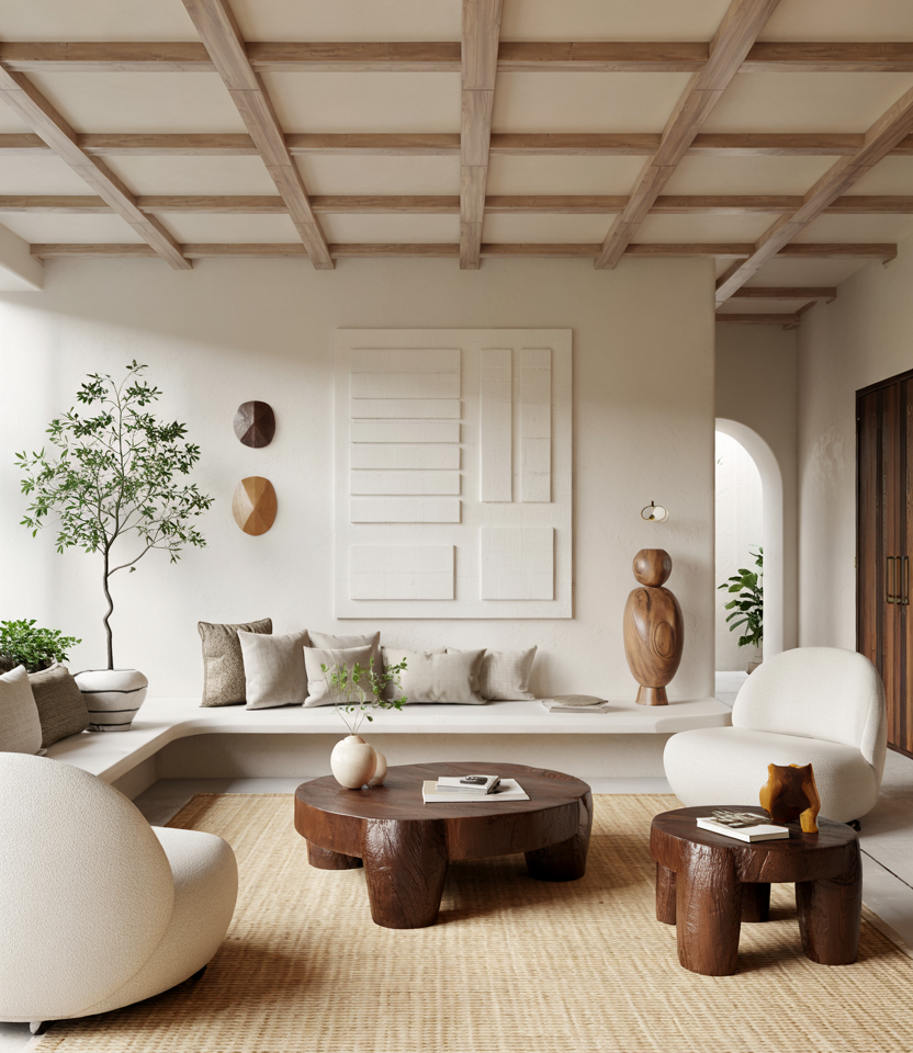 Blend modern design with organic touches: a sculptural coffee table in walnut, curved sofas in beige linen, and soft stone vases. The color palette remains neutral and earthy, with occasional pink or muted terracotta highlights.