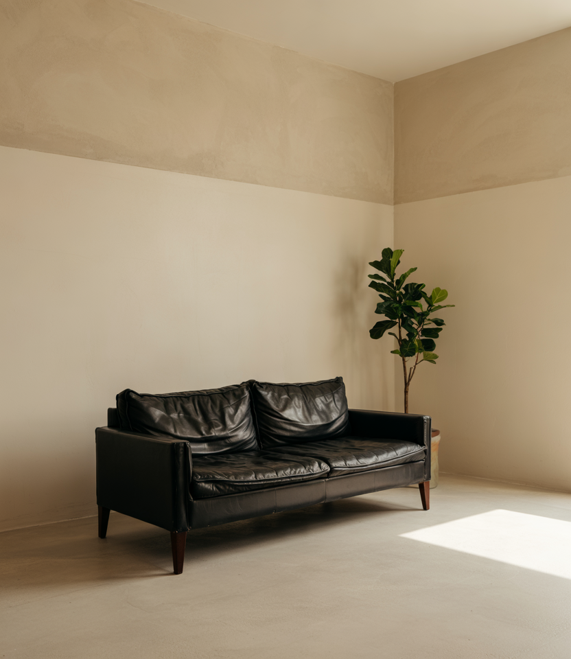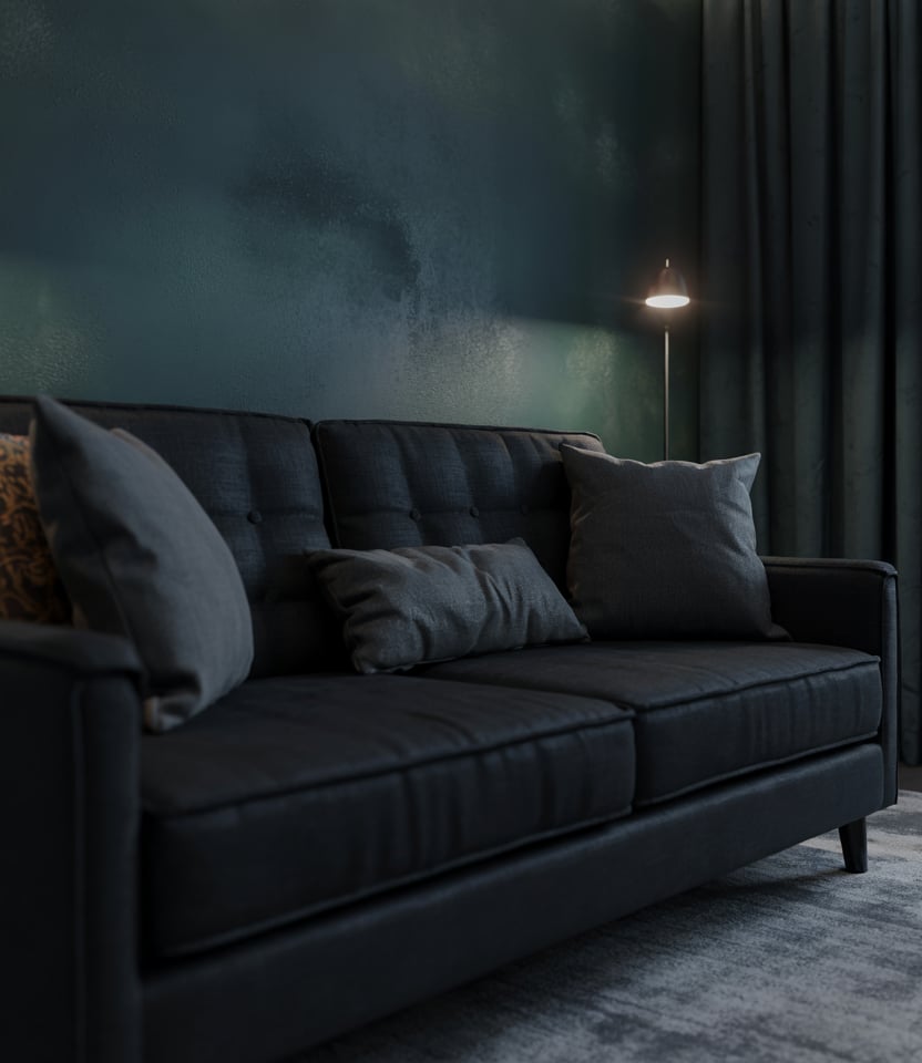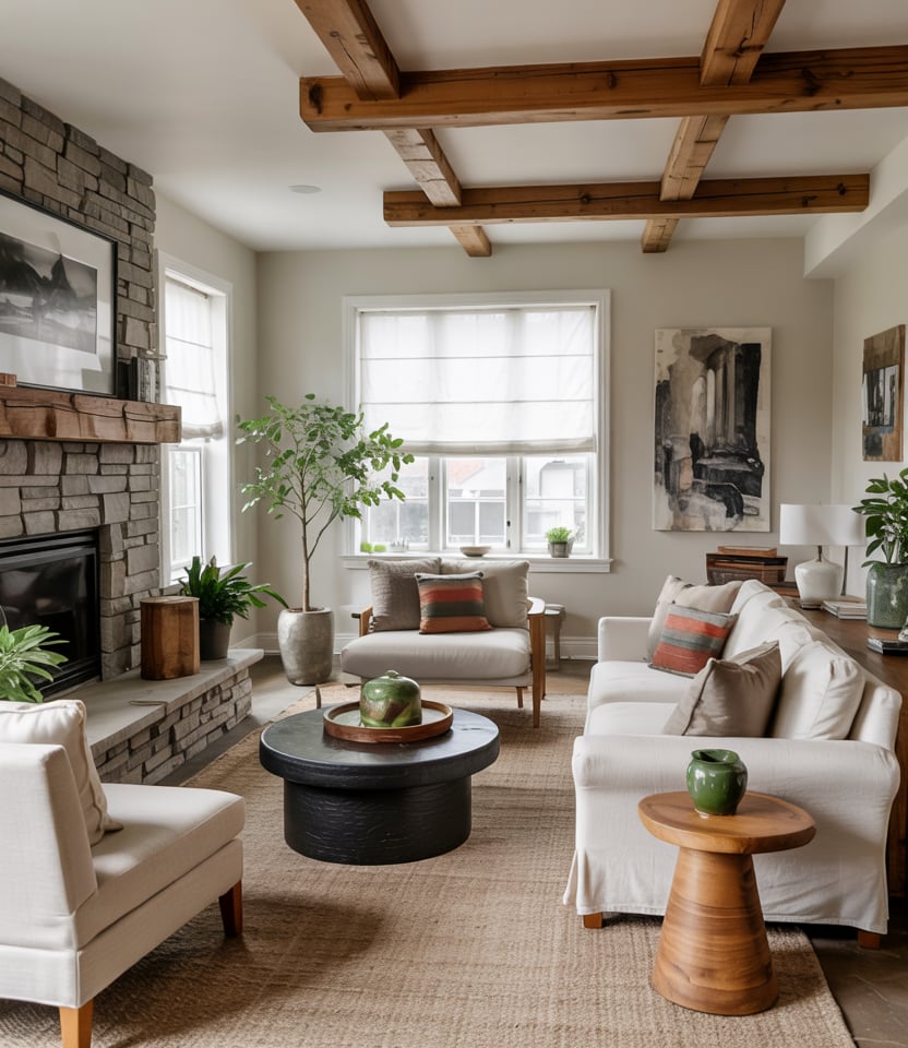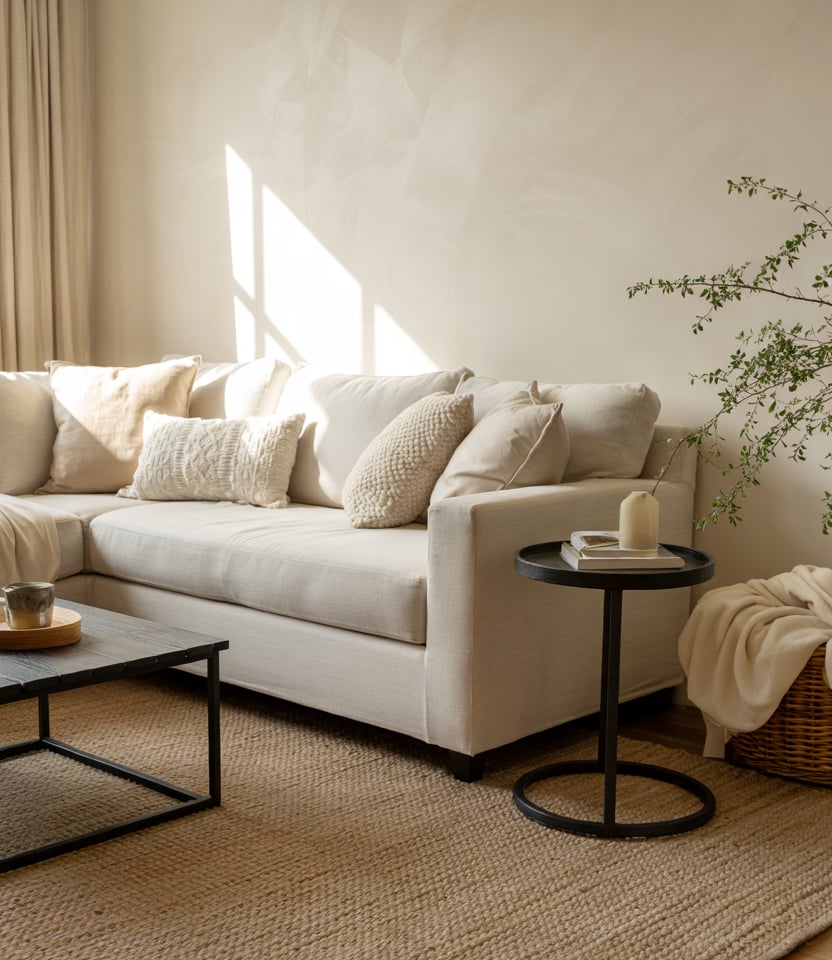 Start with a neutral base of creams, beiges, greys. Then inject a few Dark or Black elements—a black coffee table, lamp, or side chair. The contrast gives focal points without breaking the earthy serenity.