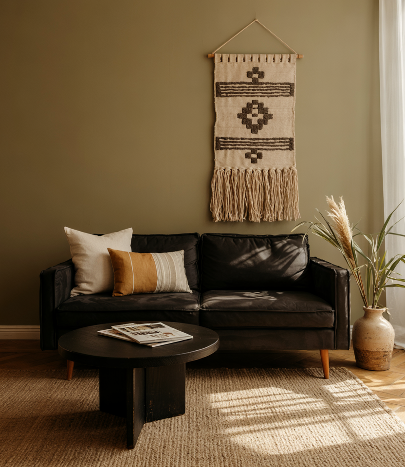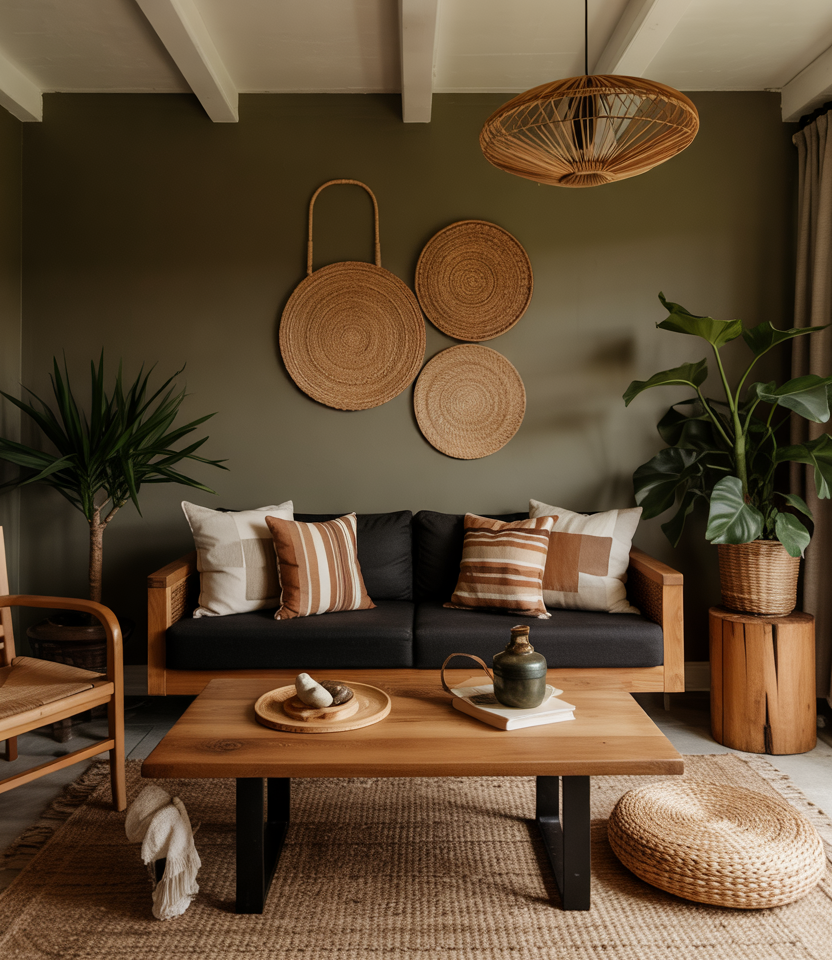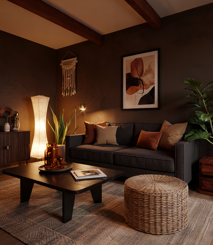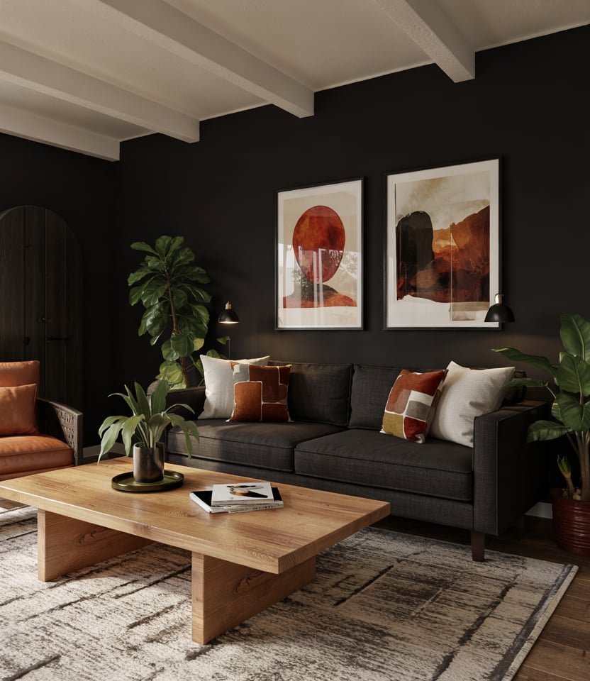 Go bold with nearly black accent walls or deep chocolate tones, paired with lighter natural elements. A black couch or charcoal seating feels right at home here. Use warm lanterns, woven rugs, and clay-colored throws to lift the mood.