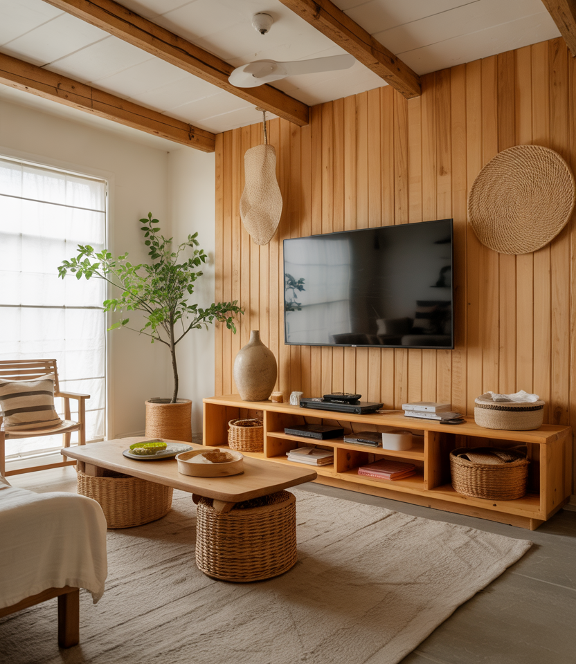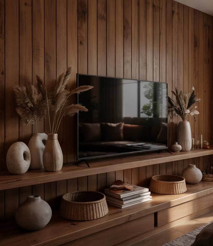 Design your with TV zone to feel grounded. Encase the wall in wood paneling or warm stone veneer, flank the screen with built-in shelves in earthy hues. A brown couch or neutral sofa faces it, and you soften the tech with woven baskets or clay vases.