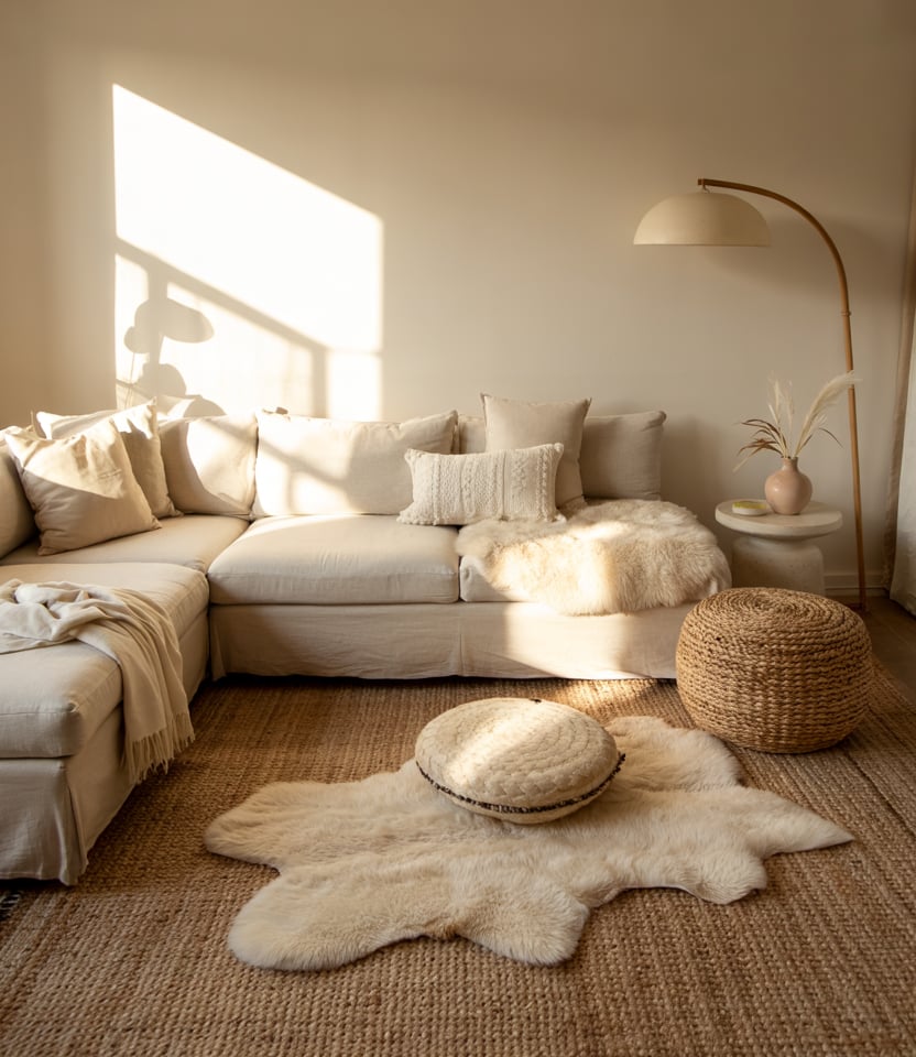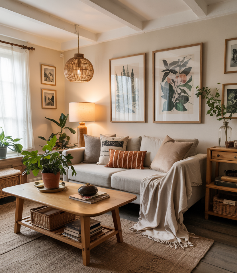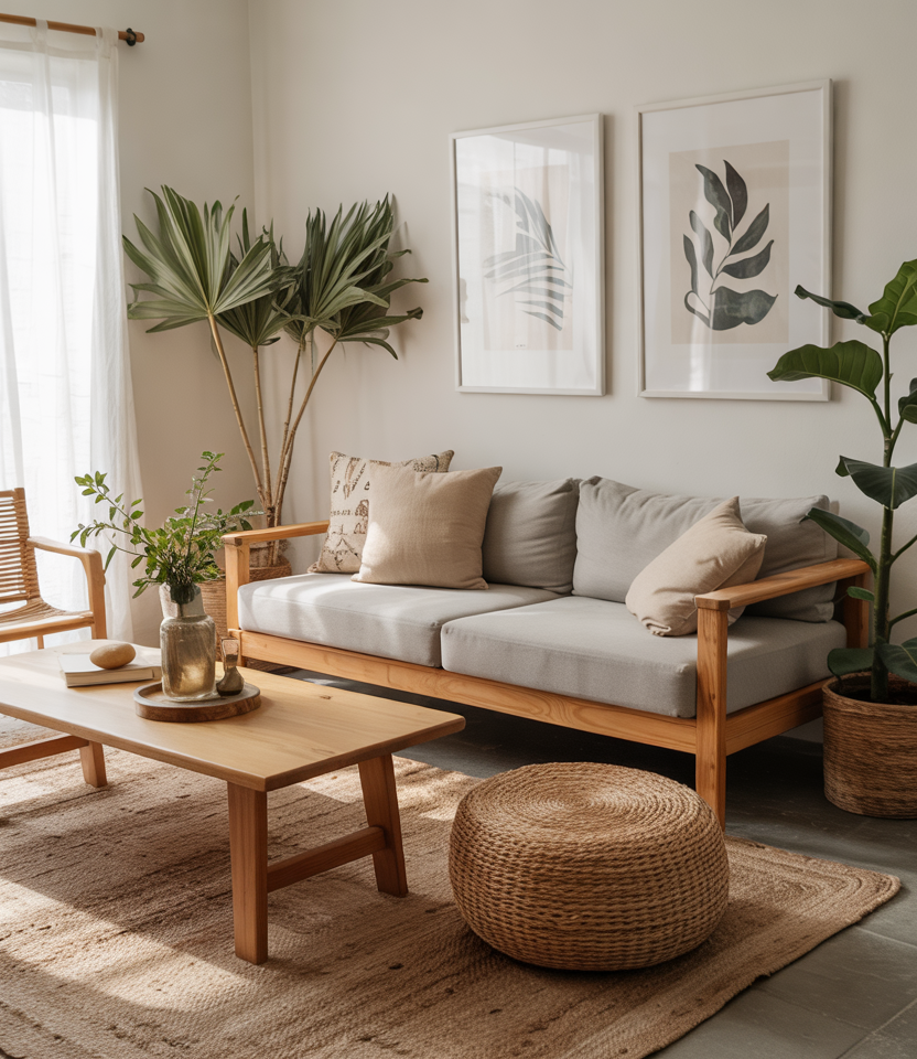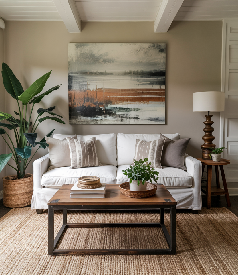 In small or minimalist homes, keep the layout spare but warm: white walls, a grey couch, and accents in jute, linen, or stone. Add one sculptural wooden coffee table and a few plants. The atmosphere stays cozy and uncluttered.
