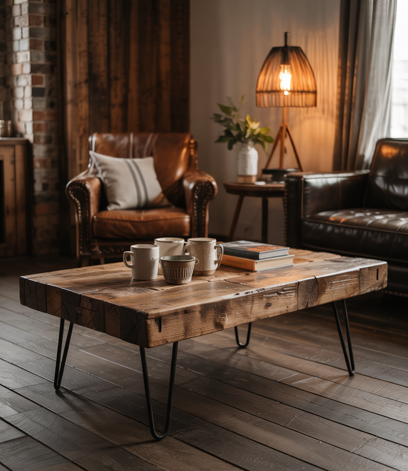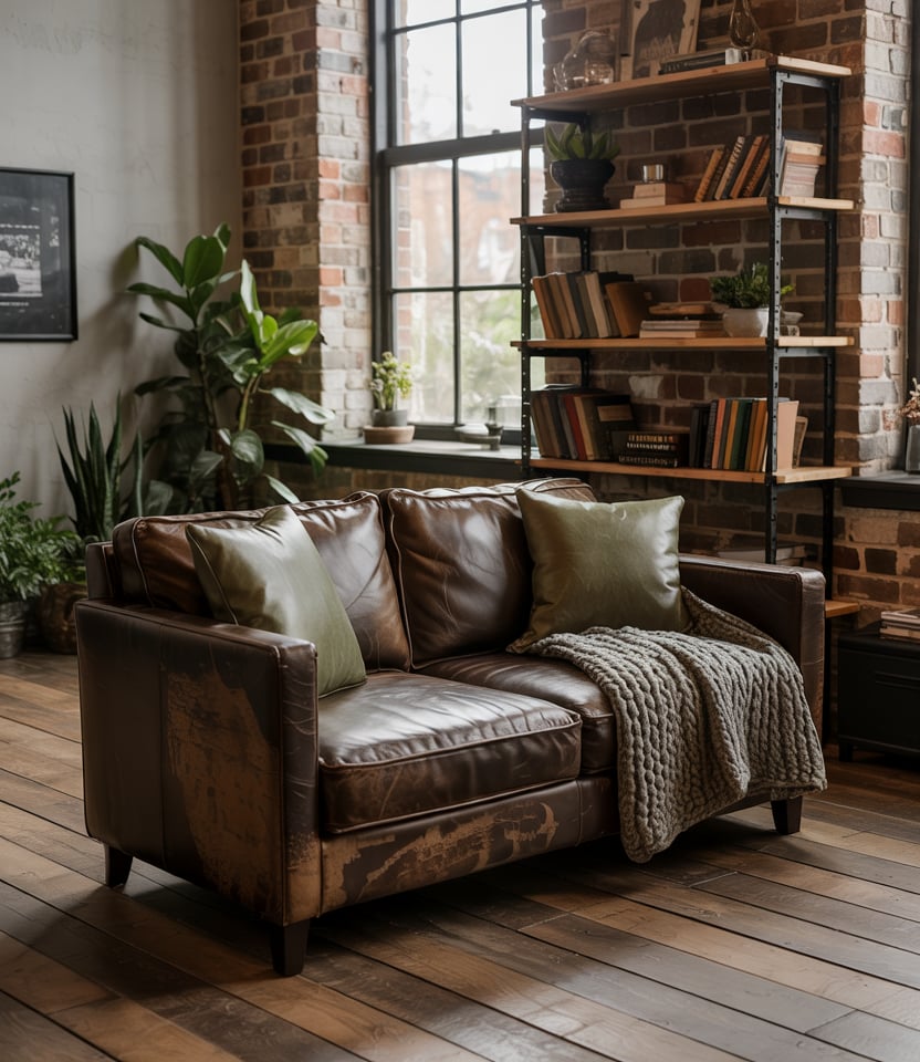 Mix raw metal frames, exposed pipes, and concrete surfaces with warm woods and earth tones. A grey couch or brown couch with leather accents fits well. Ruggedness meets warmth for a cozy industrial twist.