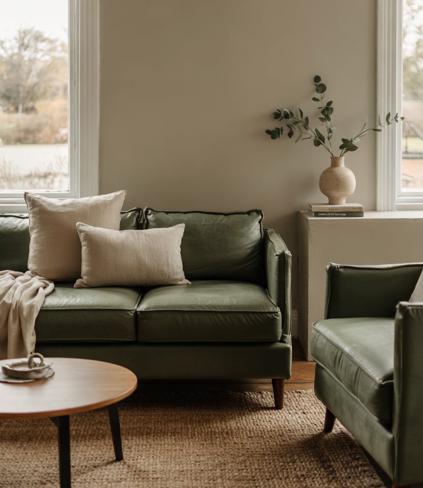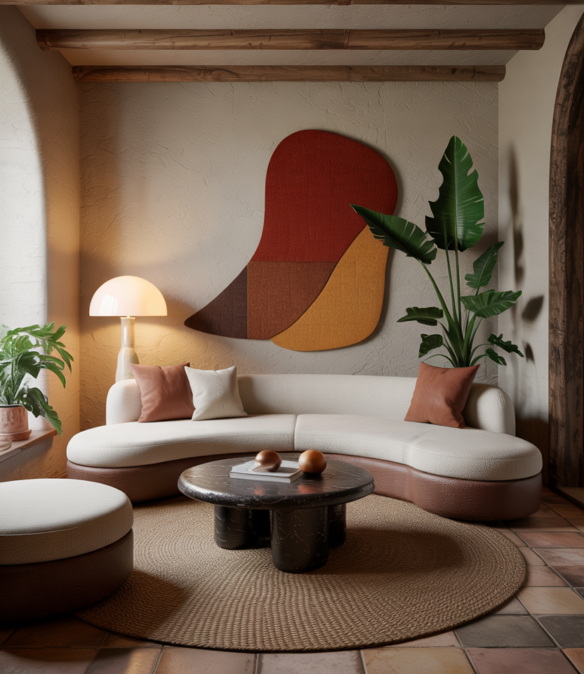Use furniture with rounded edges—curved sofas, arched mirrors, organic-shaped coffee tables—to soften a space. Keep the palette neutral, earthy, and anchored with a green couch or terracotta accessories.