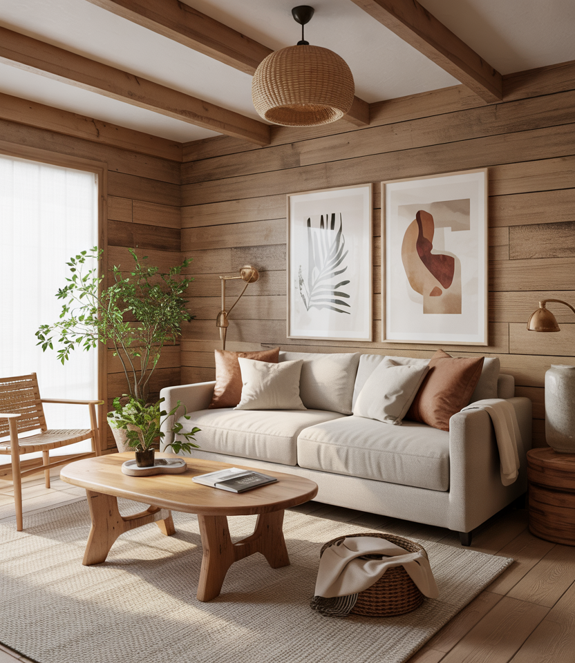 Follow the wood drenching trend: clad walls, ceilings, or built-ins in warm wood tones. Combine with neutral upholstery (grey or off-white) and stone or planted accents to avoid heaviness. Dramatic and richly grounded.