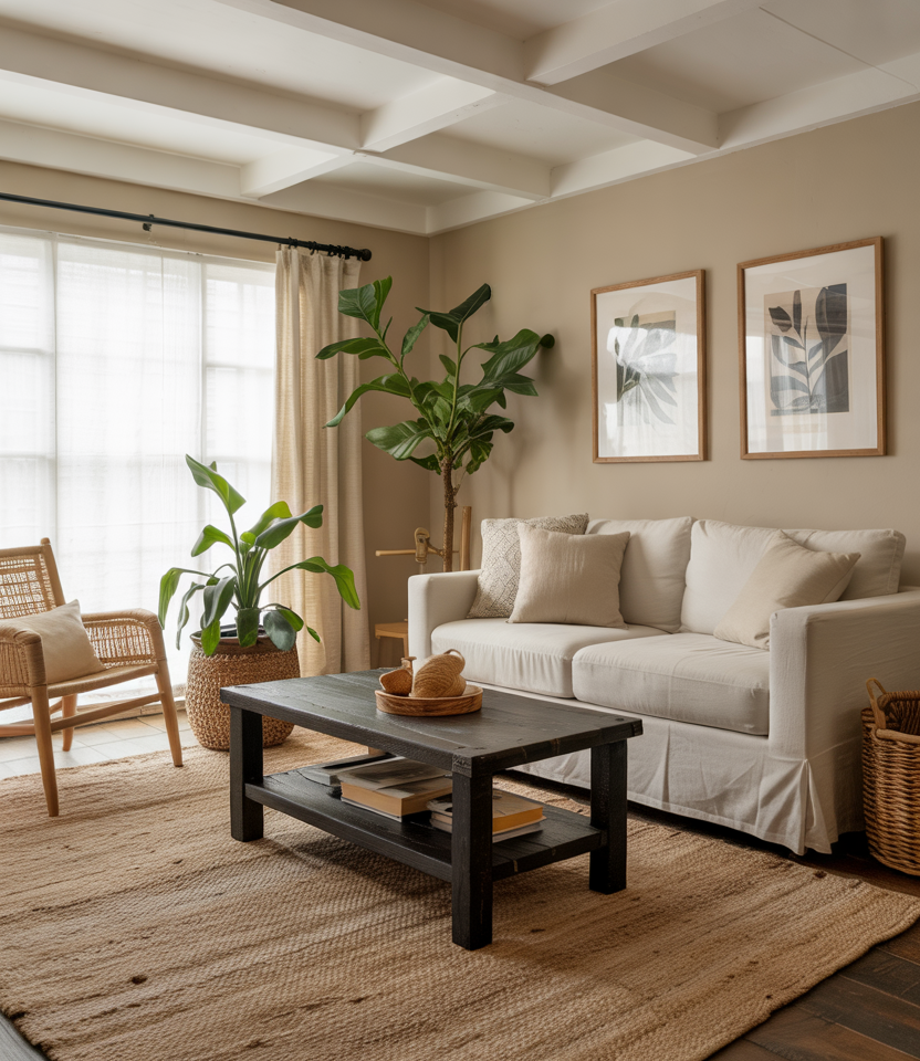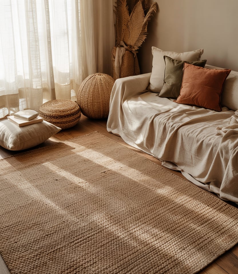 In an apartment or compact living room, create a dedicated earthy corner—say by a window—with a small grey couch or rattan loveseat, a jute rug, a few plants, and a textured floor pillow. Keep rest of the room neutral to avoid clutter.
