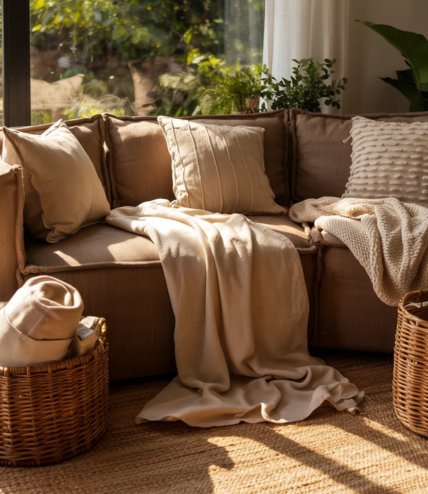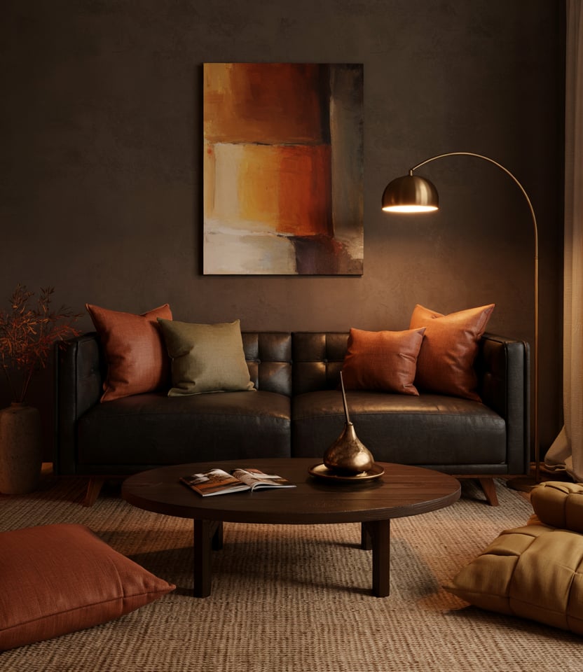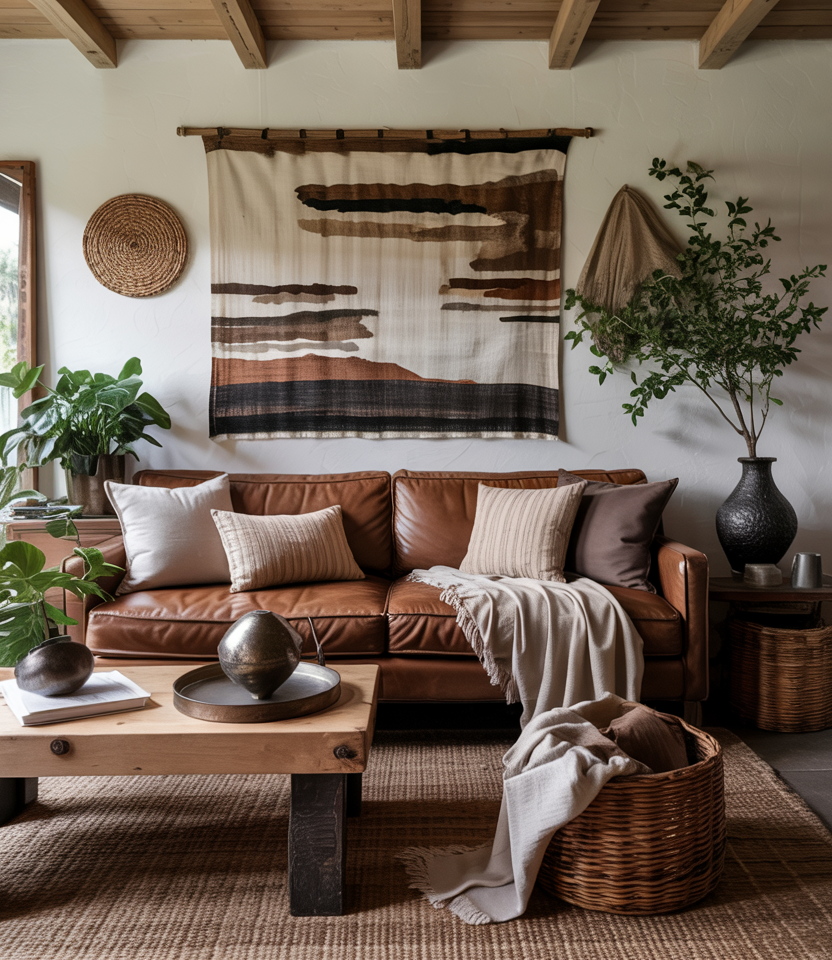 Choose a layered color scheme using many tones of brown—cognac leather, mocha cushions, walnut furniture. A brown couch becomes central, and you build in depth by mixing shades. Combine with linen curtains, rattan baskets, and off-white walls to keep the look balanced.