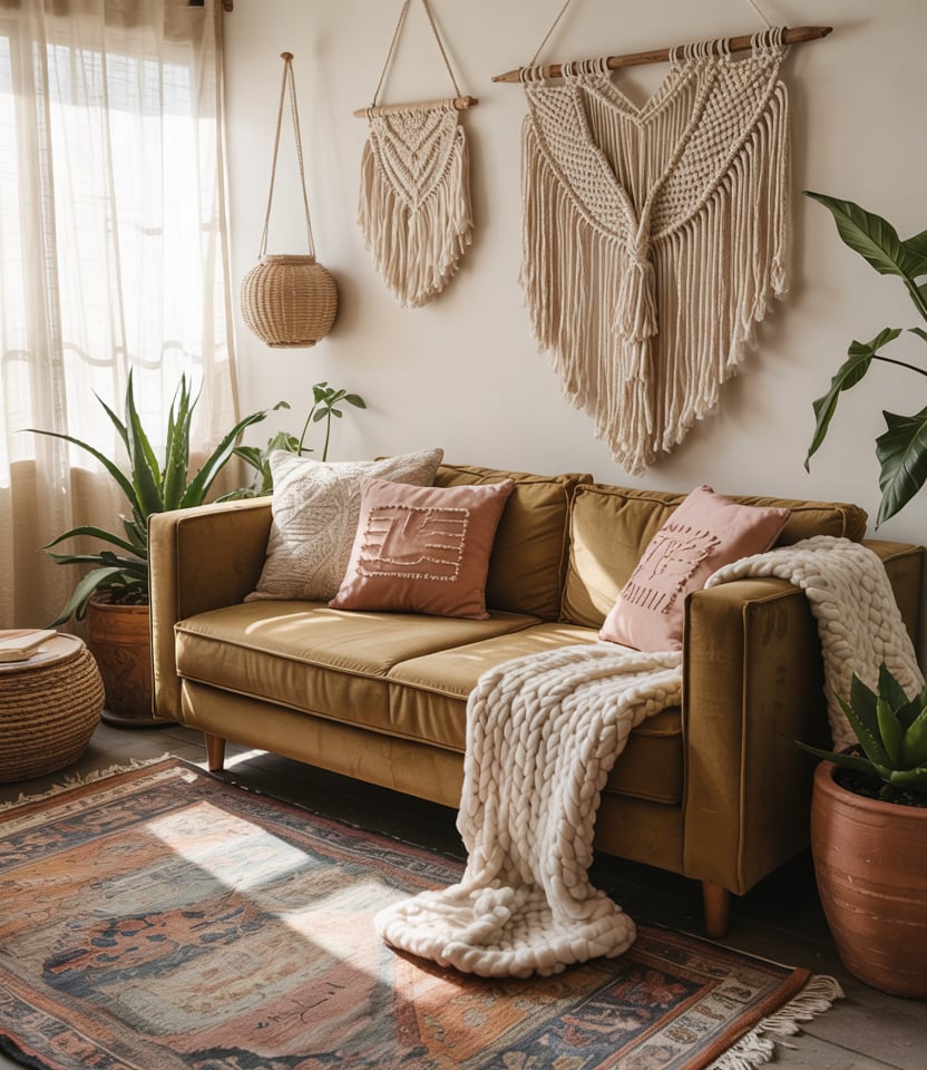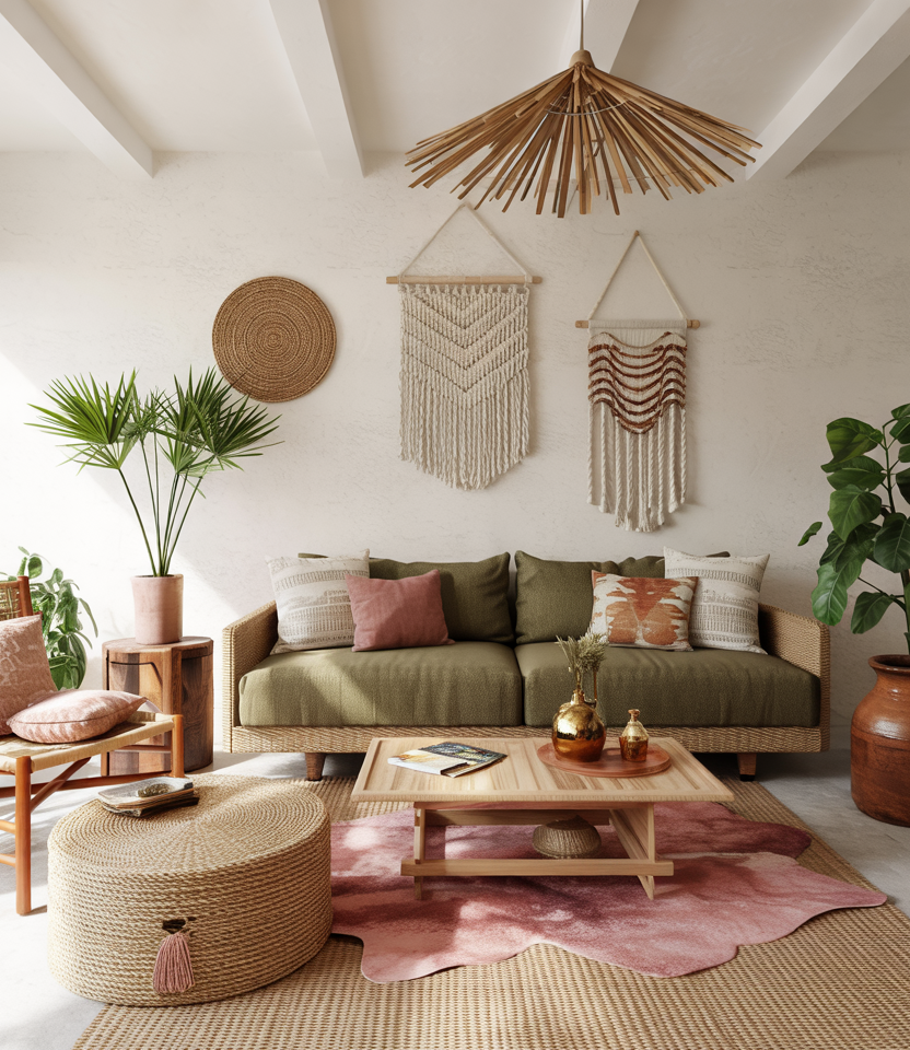 Go full bohemian with woven wall hangings, textured rugs, macramé, and warm clay ceramics. The palette stays in earth tones—sands, olives, rust—but the layering feels collected. A green couch or dusty pink cushions can serve as accent pops within the earthy base.