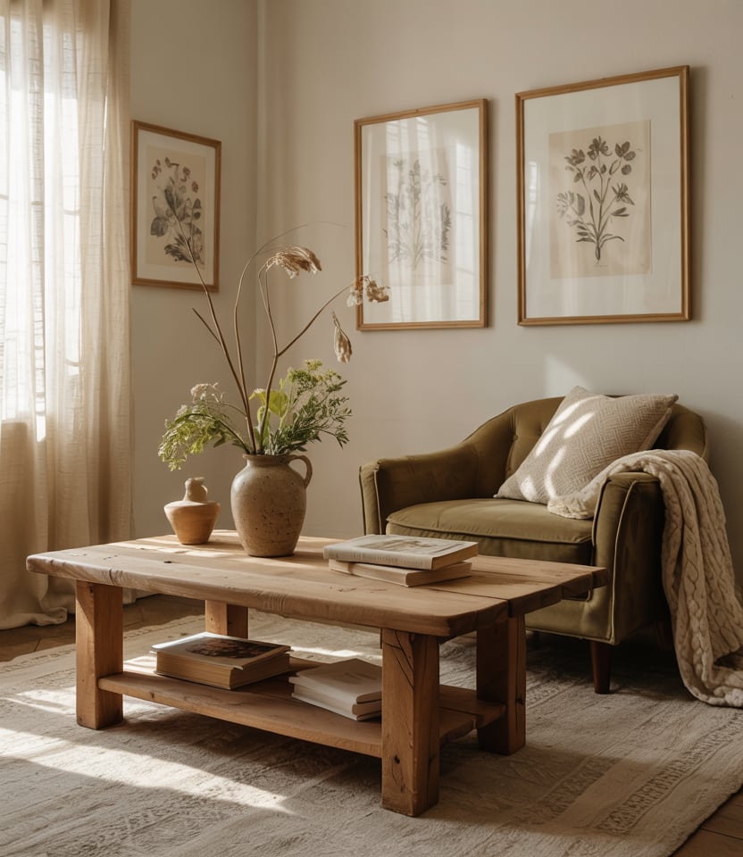 Lean into Cottagecore cozy vibes by layering soft florals, vintage wood, and gentle earth tones like sage, cream, and weathered wood. A brown couch or faded linen piece acts as an anchor. Use rattan baskets, knitted throws and botanical prints.