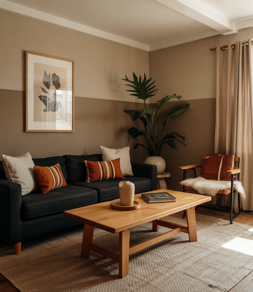 Split walls or furnishings between light and dark earthy tones—e.g. upper walls in sand and lower walls in clay. Pair a black couch bottom half and neutral top. Use terracotta or soft pink accents to bridge the contrast.