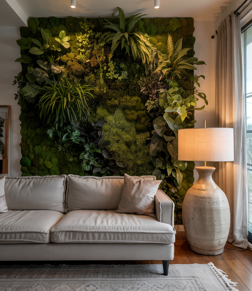 Incorporate a vertical green wall or moss panels as a focal point, behind seating. It immediately brings organic life. A black couch or dark sofa set against living plants feels lush and earthy. Use side lighting to dramatize.