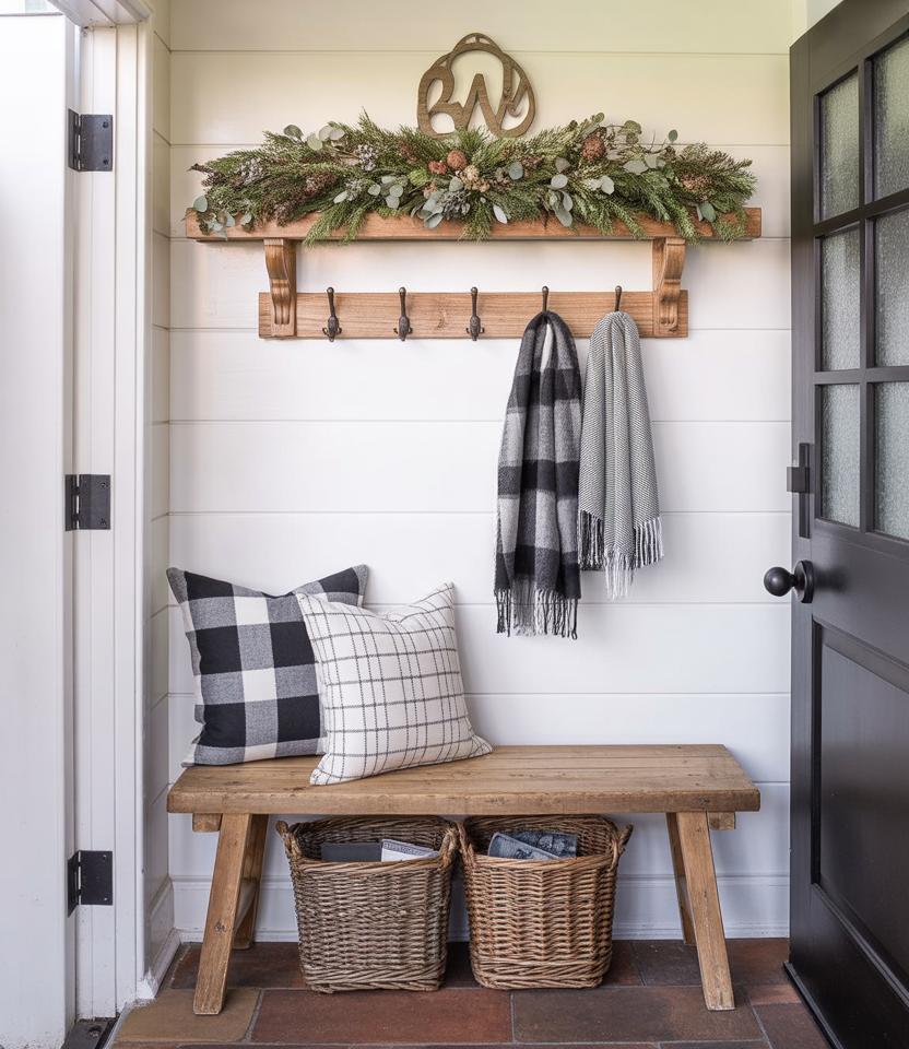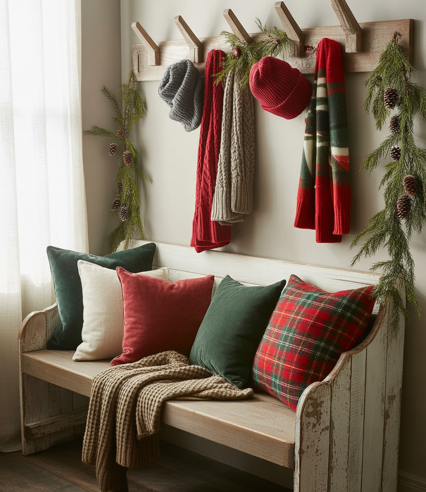 Decorations for the entryways set the mood the moment you step in. A rustic bench with plaid pillows and some hooks for scarves keeps it all practical and stylish at the same time. Seasonal rugs or greenery go a long way in keeping things looking merry. For families, it keeps all the winter gear organized and looking festive for school routines.